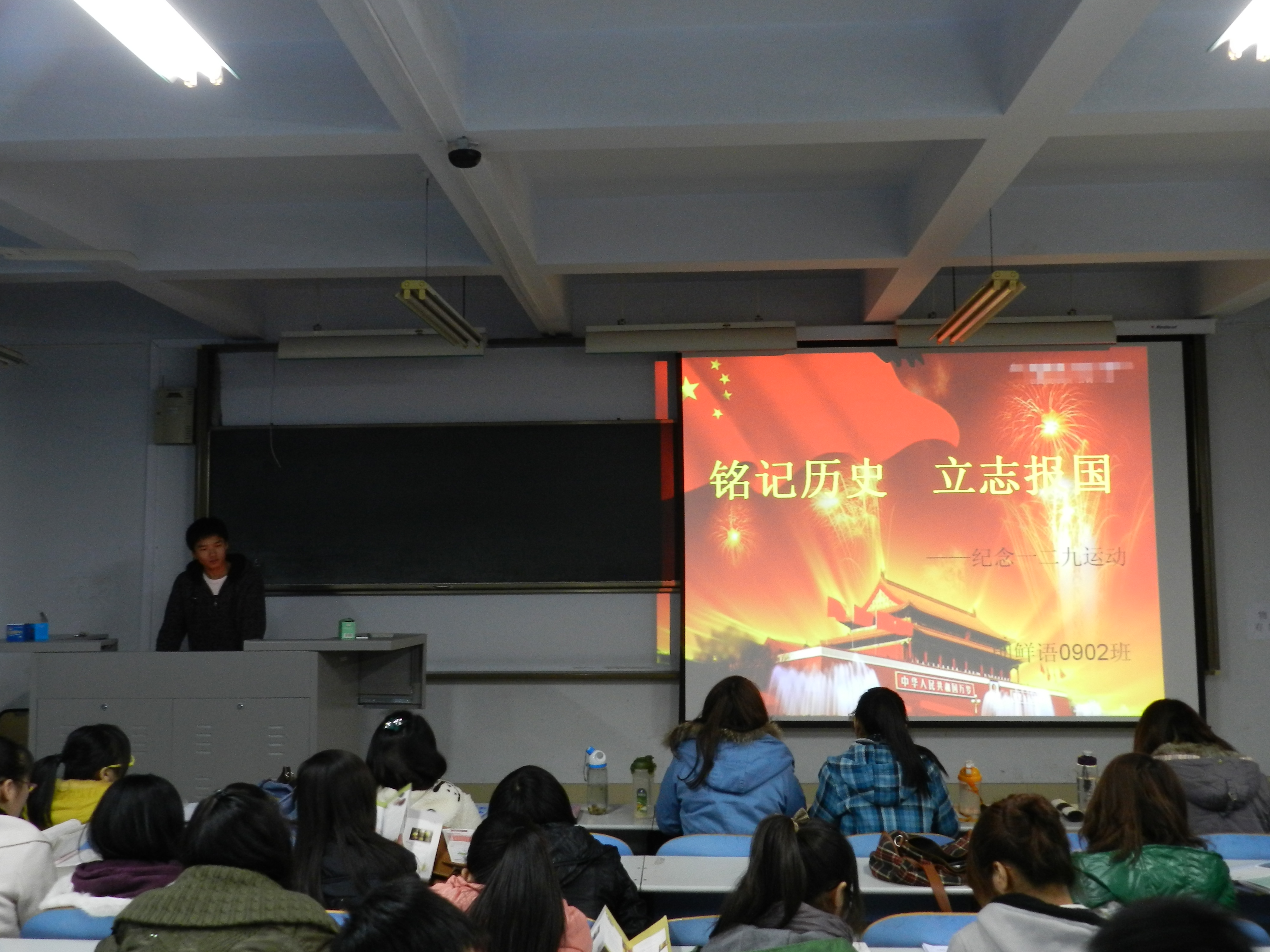 为纪念“一二・九”运动76周年,缅怀英勇牺牲的烈士,弘扬伟大的爱国主义精神,激励同学们的爱国热情,外语系各班级组织“纪念一二・九”爱国主义教育主题团日活动。