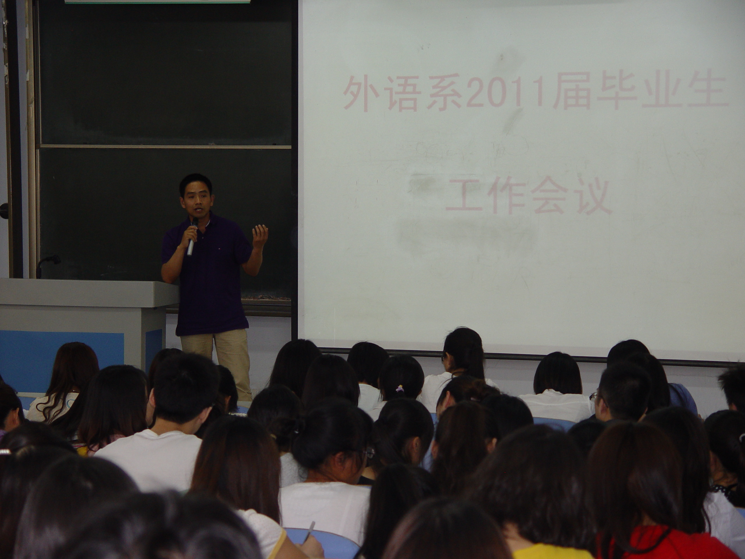 2011年5月13日下午3:00,外语系在教三楼104教室召开2011届全体毕业生大会,外语系党总支副书记杜红亮老师、全体辅导员参加了此次大会。