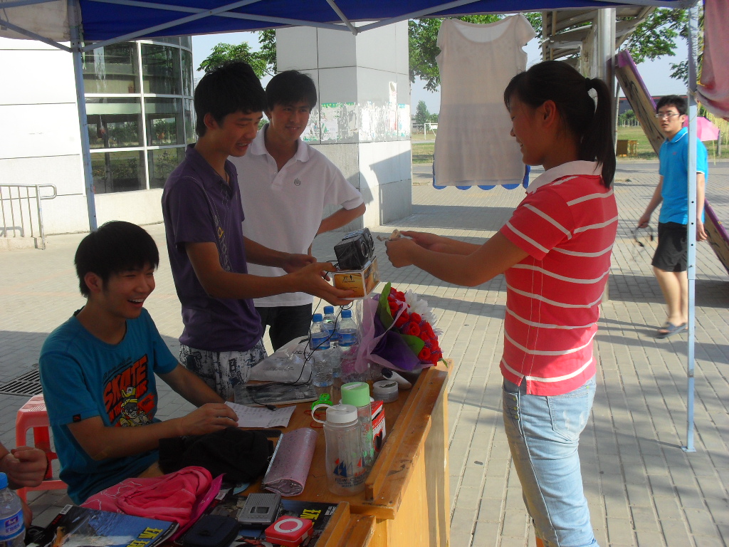 快闪的热潮还未散去,“让爱传递,牵手凝聚力量,爱心点亮希望”的口号已经响起。在当日下午四点,软件学院为欢度校庆在科学校区学生服务中心门前举行了校园广场“爱心义卖”活动。在炙热的太阳下面,络绎不绝的同学走向卖场问及活动详情。他们踊跃参与,纷纷