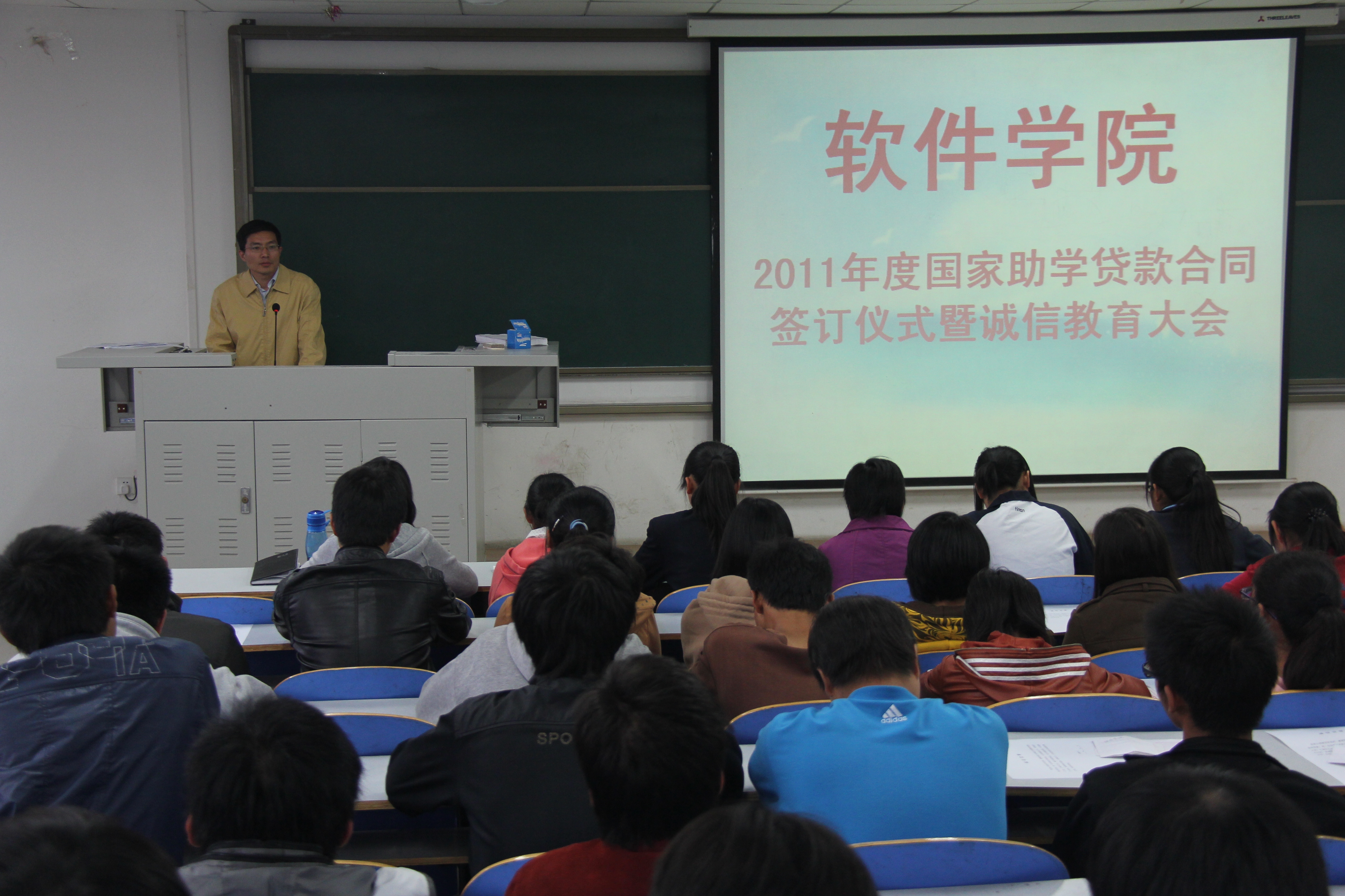 10月29日下午,软件学院在科学校区电教楼203教室举行2011年度国家助学贷款合同签订仪式暨诚信教育大会。党总支副书记武丰龙、部分辅导员及2011年度贷款学生参加了会议。