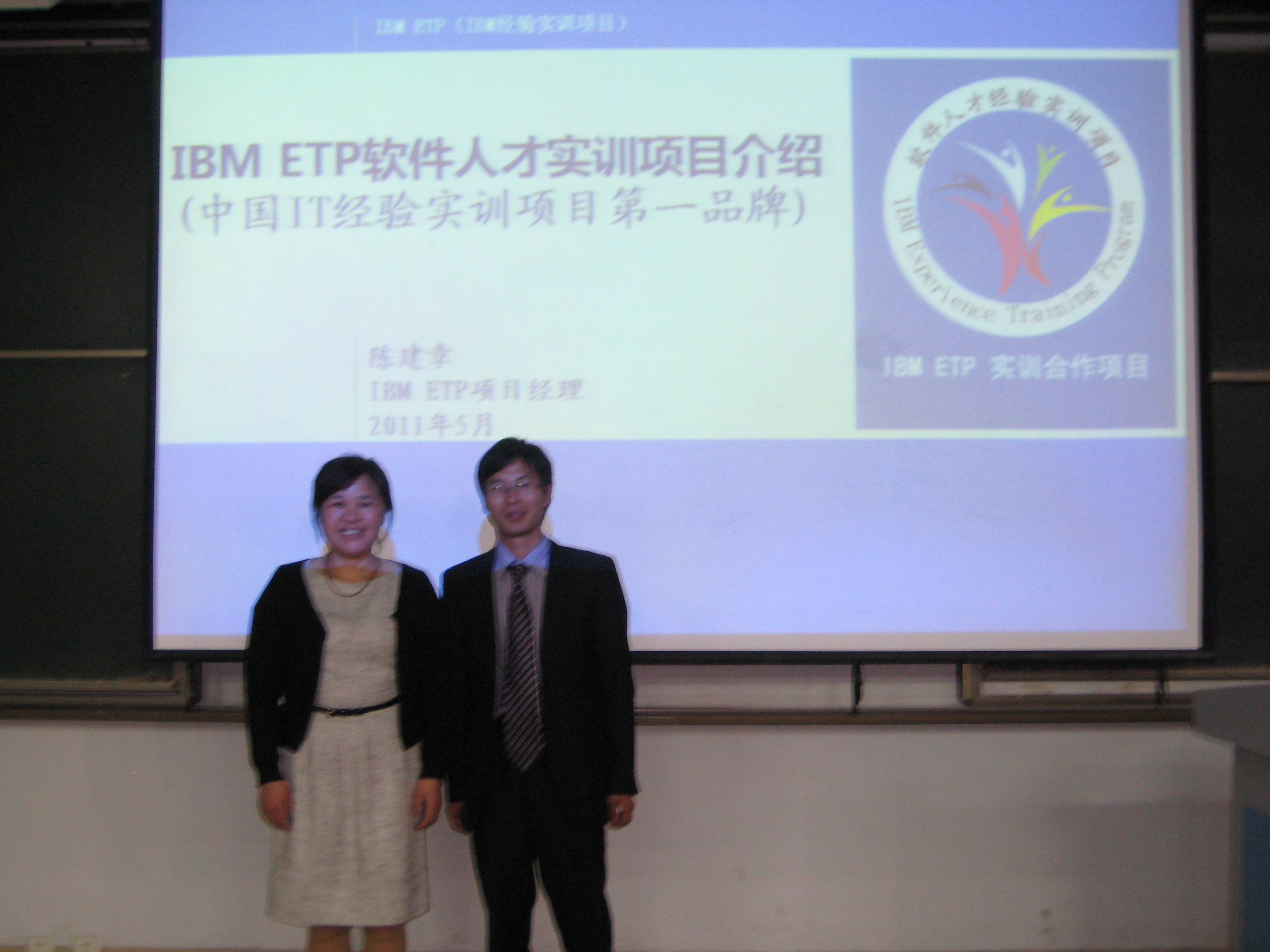 2011年5月12日,IBM无锡实训基地实训部部长陈建章工程师又到软件学院商谈进一步加强校企合作、支持软件卓越工程师培养项目的事情。并且,将在08级软件工程、软件测试专业挑选一批学生到基地参加免费实训,并负责就业。陈老师为同学们介绍了软件外包形式、实训项目体系内容,并组织了测试。软件学院副院长邓璐娟教授给同学们做了动员并回答了同学们的问题。