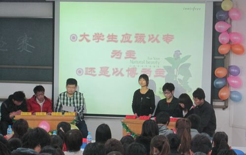 辩论赛初赛共分为三轮,由六个专业代表队来参加比赛,并围绕“大学生应当以博为主还是以专为主”、“大学生做兼职利大于弊还是弊大于利”、“网络使人更亲近还是更疏远”三个辩题展开激烈辩论。辩论过程中参赛双方围绕辩论主题展开激烈辩论,妙语迭出,观众掌声不断。选手们通过立论、提问、自由辩论、辩题总结等环节的精彩表现使同学们对辩题有了深入的认识。辩论结束后,由常亮老师对双方的表现进行了精彩的点评。