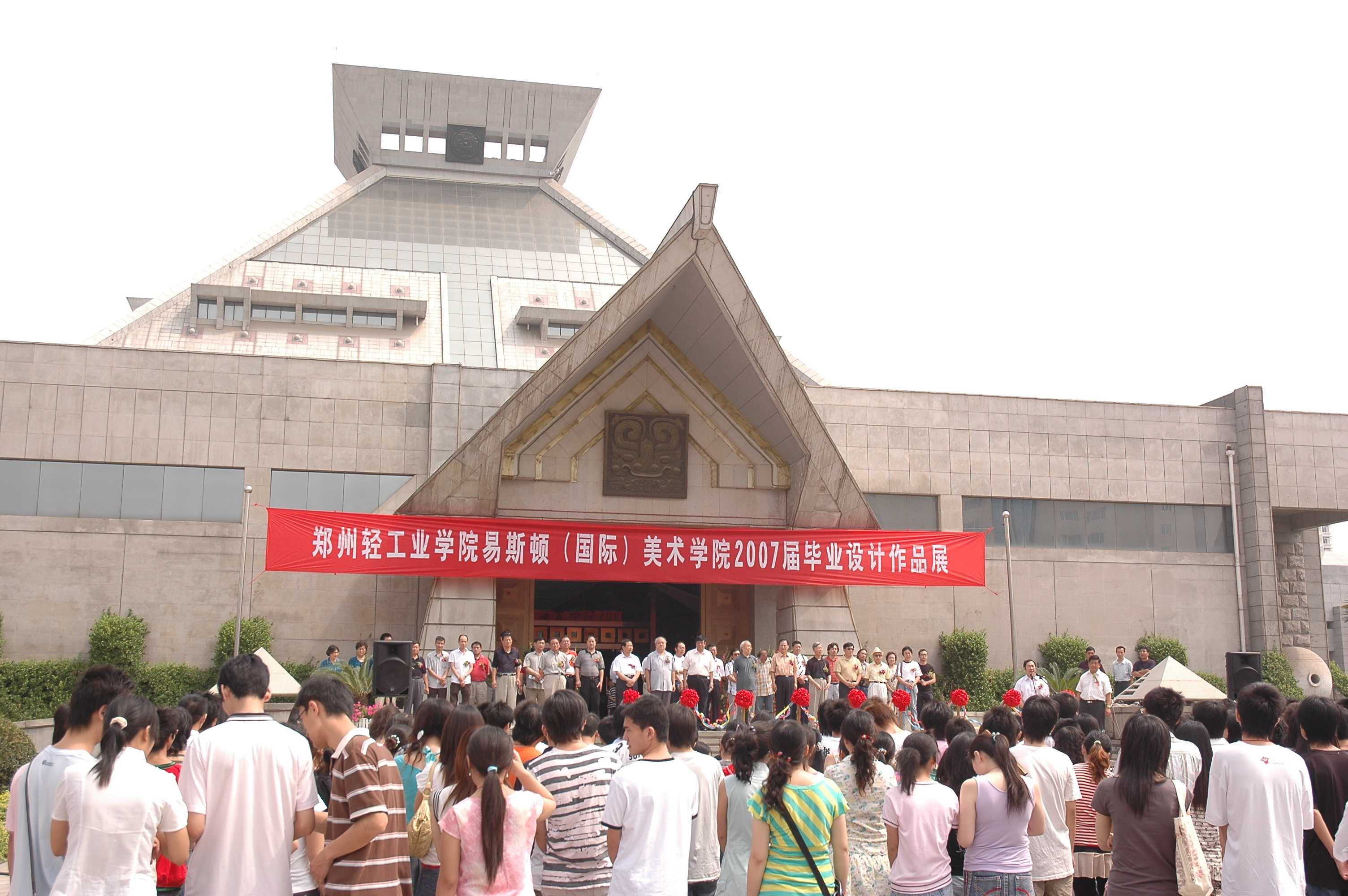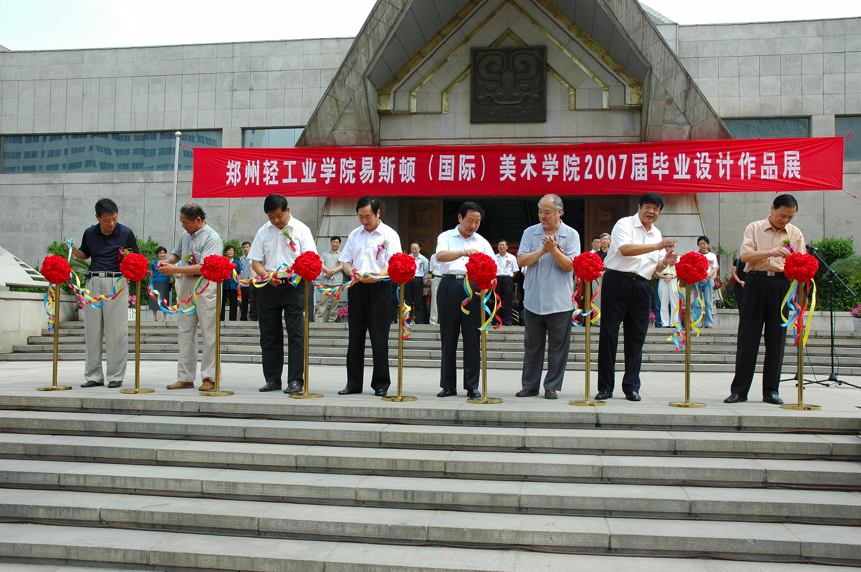 6月17日上午,郑州轻工业学院易斯顿(国际)美术学院2007届毕业生作品展开幕式在河南省博物院举行。校长剧乂文教授在副校长张鑫教授和合作办学管理处有关人员的陪同下出席了开幕式,并和易斯顿(国际)美术学院董事长王福祥先生、院长扈涛教授、应邀出席的业内人士、兄弟院校有关领导一同为开幕式进行剪彩。