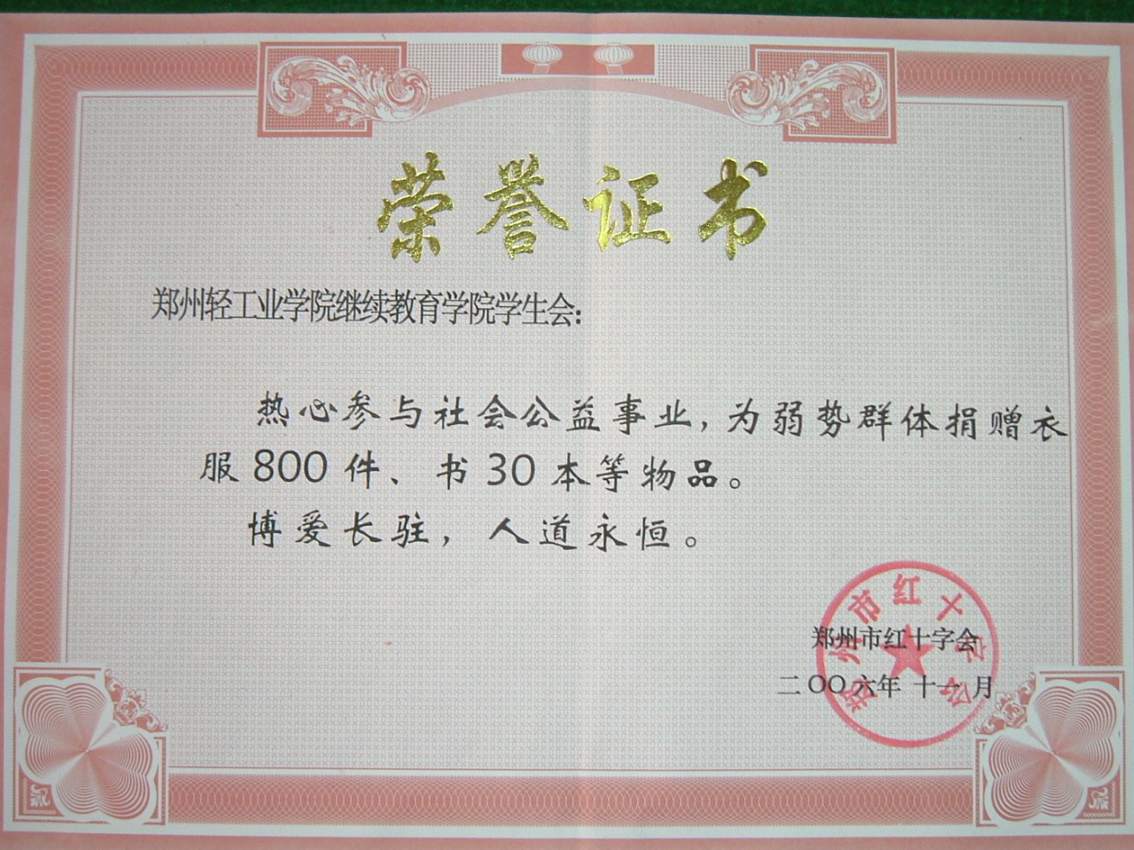 活动得到郑州市红十字会的大力支持与指导。10日下午,市红十字会专程派车接走衣物书籍,向分院颁发了荣誉证书,并与在场同志合影留念。