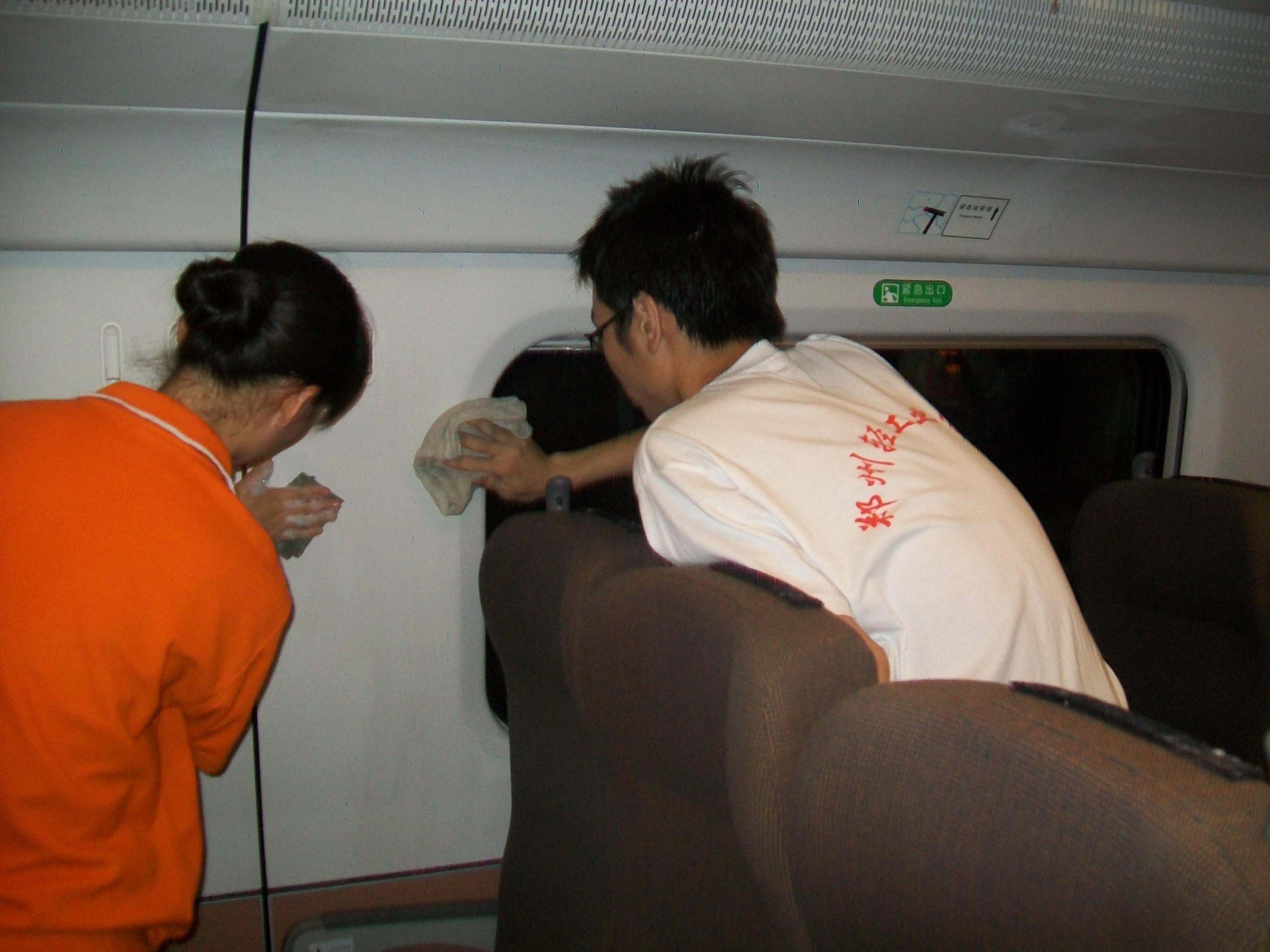 8日,队员们带着事先准备好的宣传页和条幅来到郑州火车站内,积极向乘客宣传文明乘车、践行环保,促进车站和谐发展,并派出部分队员协助乘务员组织乘客排队上车。晚上,在与保洁公司员工充分交流后,大家带着听到的诸多建议迅速进入服务站台、车厢,熟悉了环境选好地点,便热情满怀地投入了“战斗”,扫地、除尘、擦窗、去污……队员们配合默契,不计苦累,从当晚22:30一直忙到次日凌晨6:00,终于与保洁工作人员一起完成了对“和谐号”各个角落细致、全面的清扫。至此,疲累的同学们无不深刻地认识到文明乘车、自觉环保的重要性,真正体会到基层工作的艰辛、繁琐,纷纷表示此次义务劳动对自己将来更快、更好的适应社会环境有很大的帮助。
