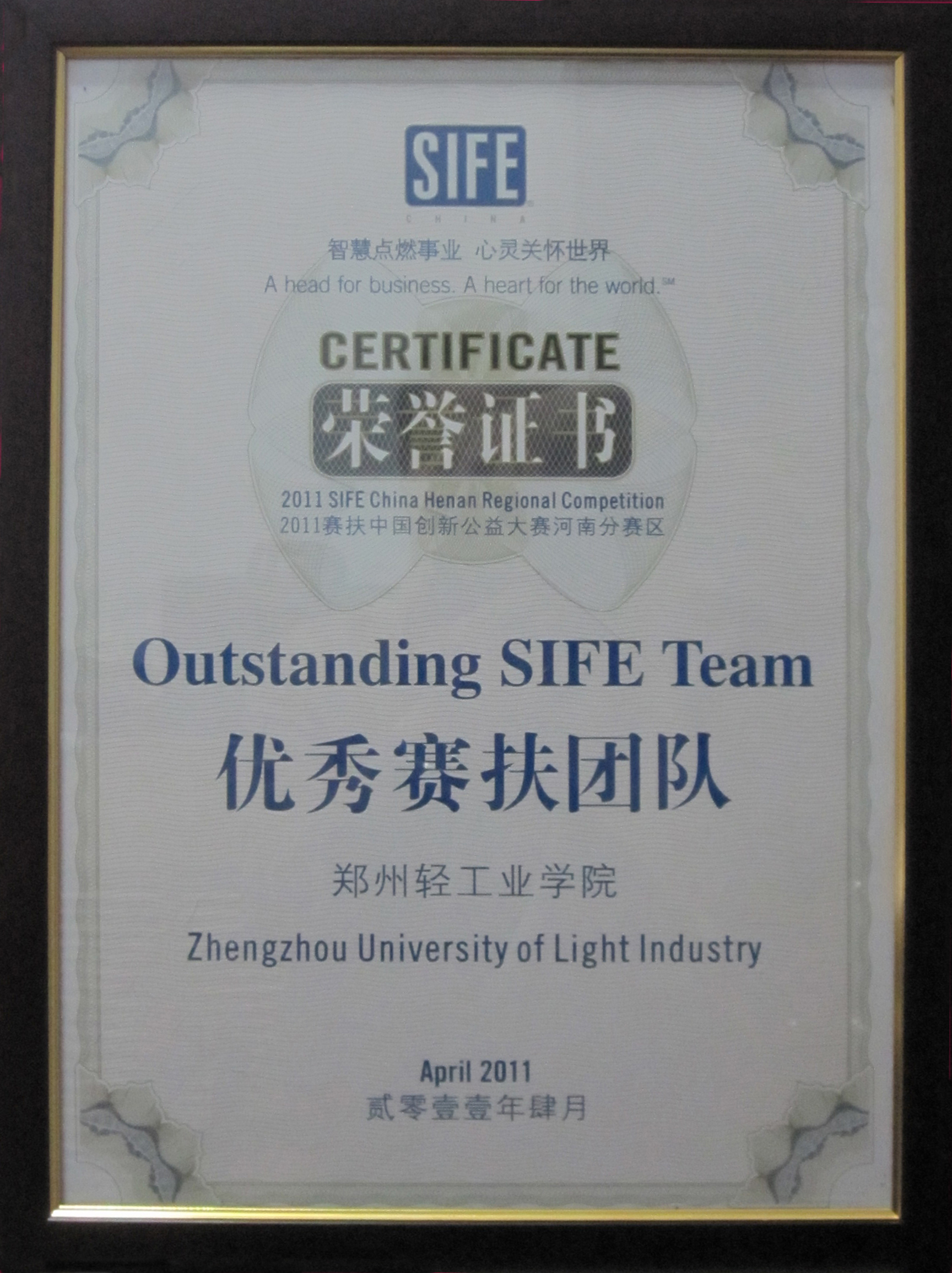 2011赛扶(SIFE)中国(国际大学生企业家联盟)大学生创新公益大赛河南区域赛于2011年4月6日在郑州大学拉开帷幕,来自郑州轻工业学院、郑州大学、河南工业大学、河南师范大学等11所高校的赛扶团队参加了最终决赛,我校赛扶团队取得优异成绩。