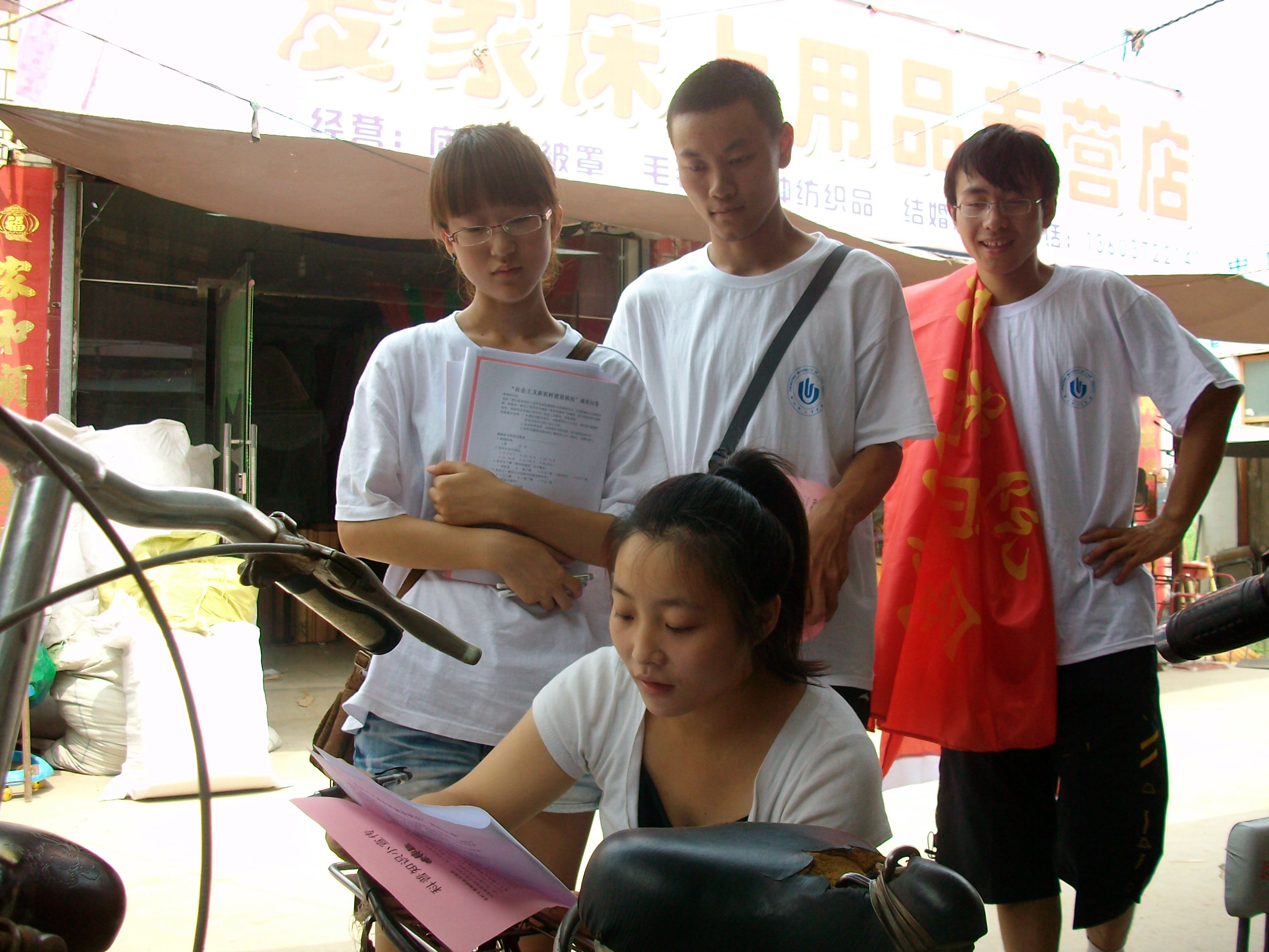 次日,小分队正式展开了此次调研活动。队员们不畏酷暑,挨家挨户地走访,耐心地给村民讲解此次调研活动的目的。所谓“智者千虑,必有一失”,尽管小分队之前做了详细的计划,但还是出现了一些问题。由于他们在设计问卷时没有考虑到村民的理解能力,造成一些村民对调研问题不理解而无从答起的尴尬局面。然而队员们并没有因此而放弃,他们耐心地把调研问题读给村民听,从而顺利地完成了当天的调研活动。为了尽量避免以后出现类似的情况,队员们针对当地村民的现实情况,及时修改了调查问卷并取得了良好的收效。
