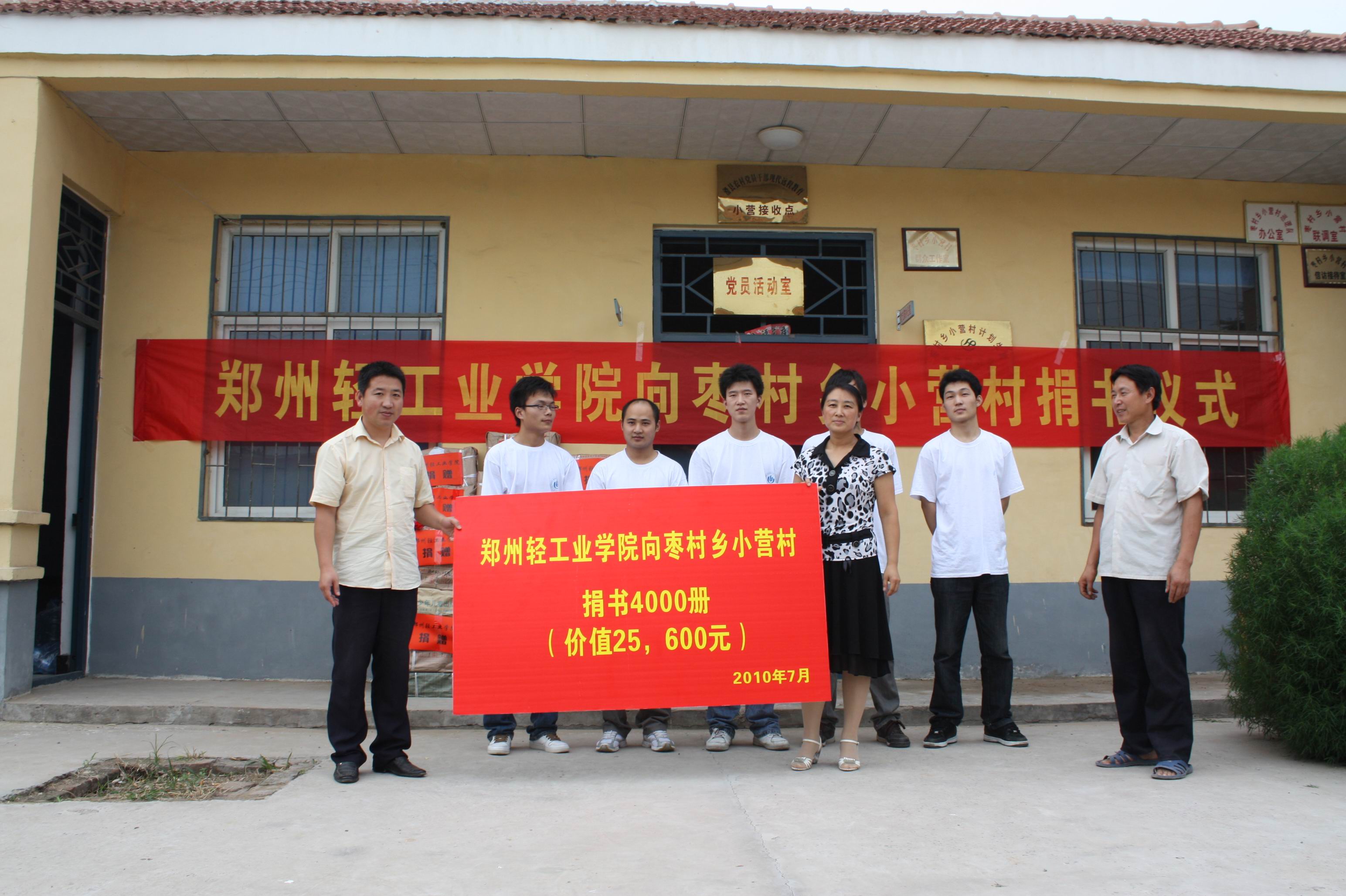 7月16日,小分队一行7人前往位于豫北平原的我校对口帮扶对象――滑县枣村乡小营村,开展新农村建设帮扶工作暨大学生暑期社会实践活动。小分队的到来受到了当地村民的热烈欢迎。在小营村村委会举行的赠书仪式上,枣村乡相关主要领导出席了捐赠仪式。高书记代表学校向该村捐赠了4000册书籍(价值25600元),捐赠仪式受到了当地媒体的特别关注,滑县电视台对此作了全面报道。