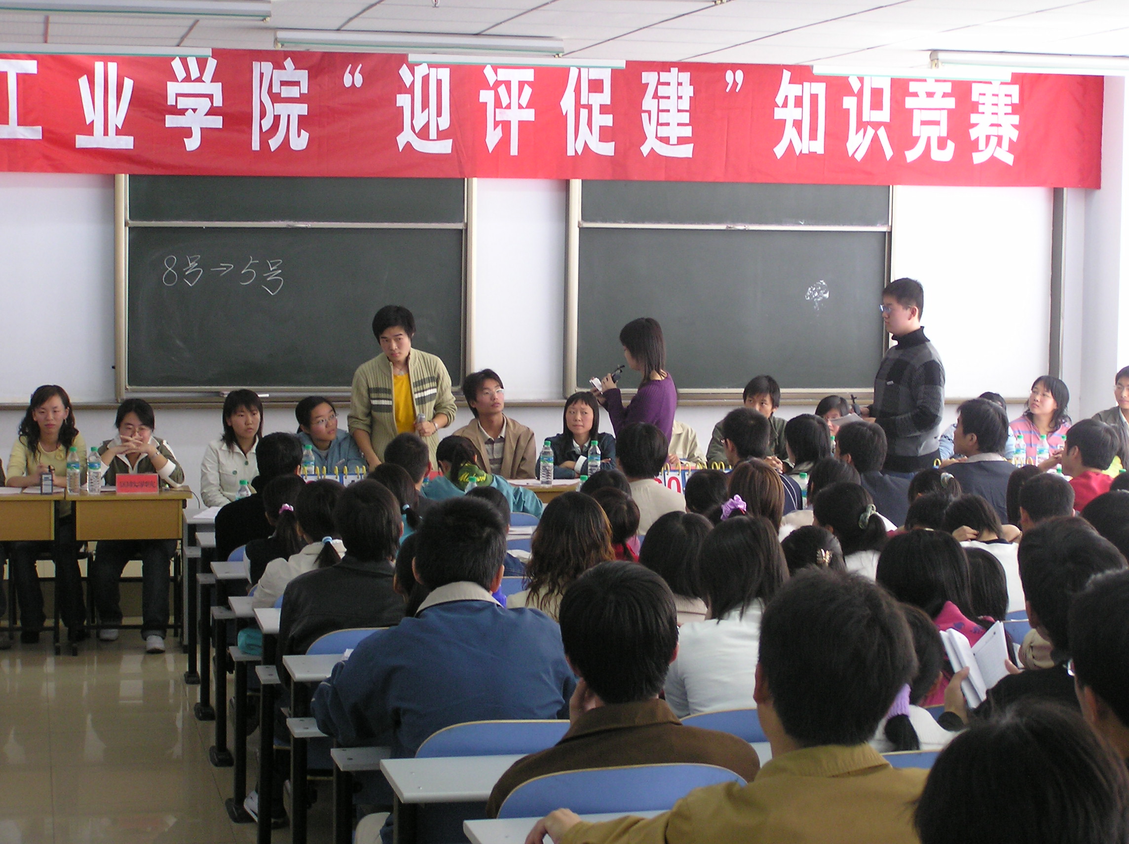 为了更好的宣传介绍评估知识,使全体学生深刻了解本科教学工作水平评估的重要性和紧迫性,在全校范围内掀起“迎评促建”新高潮,使人人关心评估,人人参与评估,人人为评估做贡献。2005年10月15日、16日,我校在教3楼105隆重举行了“迎评促建”知识竞赛活动。本次活动由校团委主办、校学生会承办,全校14个院(系)共派出14支代表队参加。