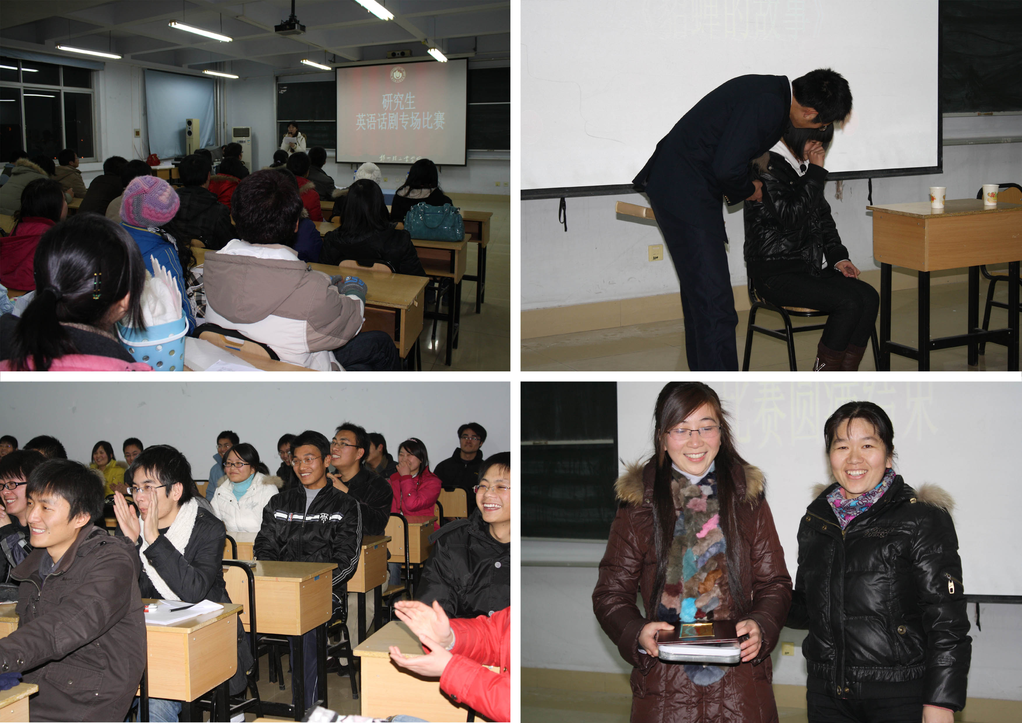 经过近一个月的筹备,12月20日晚在教三楼1001,由研究生会英语时空举办的“研究生英语话剧比赛”在研究生处的支持和研究生会各部门的相互配合以及同学们的积极参与下圆满结束。