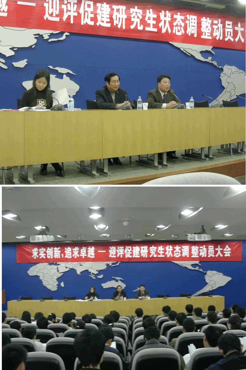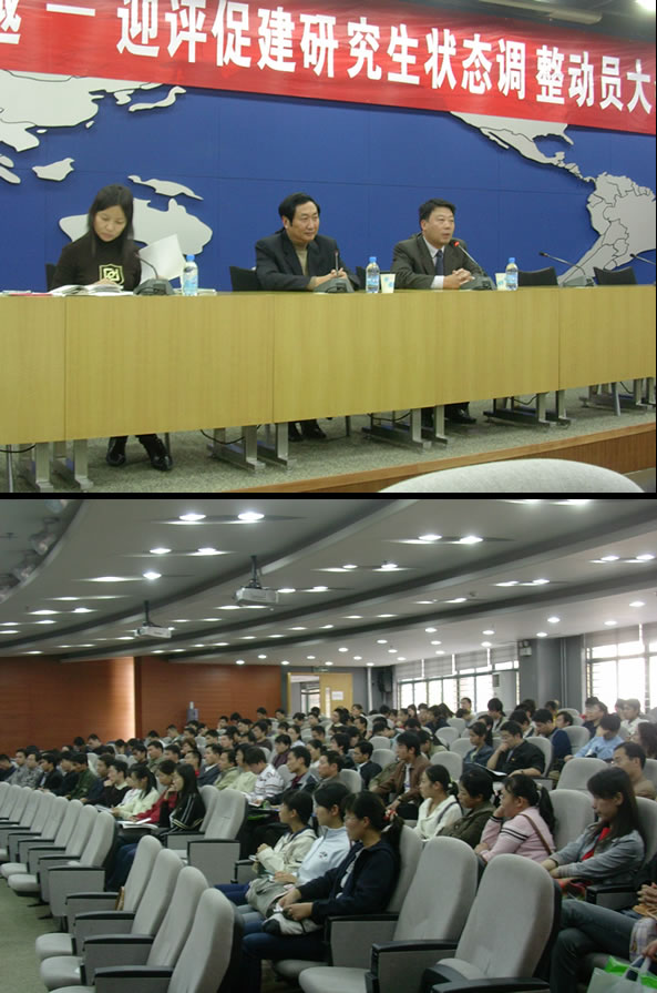 8日下午,研究生处在图书馆一楼学术报告厅针对全体研究生举行了一场“求实创新,追求卓越――迎评促建研究生状态调整动员大会”,张鑫副校长,研究生处李蔚、刘建秀处长出席了本次会议。