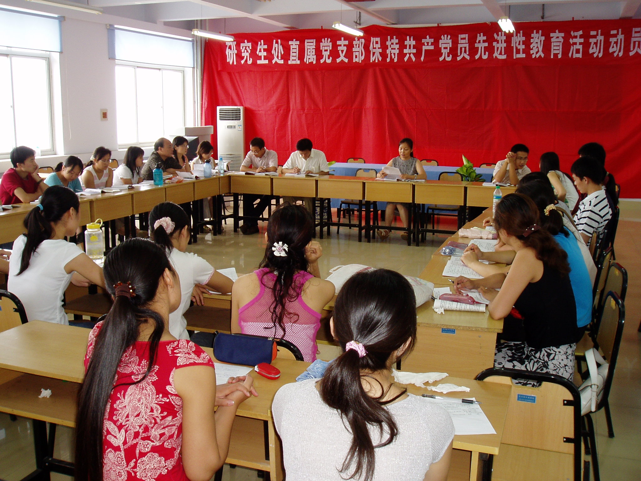 2005年7月7日至7月18日,研究生处直属党支部开展了关于共产党员先进性教育活动的集中学习。本阶段是我支部第一阶段的学习提高阶段。共有40学时,通过专家讲座,专题讨论,观看优秀党员先进事迹录像等形式进行教育,教学与讨论穿插进行,互动性很强,研究生处全体党员受益匪浅,对党的认识都有了质的提高,思想觉悟也上升到了新的水平。