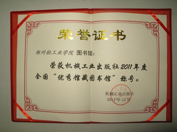2011年11月底,机械工业出版社在厦门举办了“优秀图书馆颁奖大会”。此次大会在全国共评出30多家图书馆,我校成为河南省唯一一家获得机械工业出版社2011年全国“优秀馆藏图书馆”称号的图书馆。
