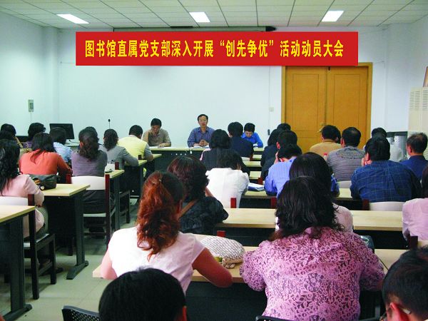 根据学校党委的统一部署和安排,图书馆直属党支部及时成立了深入开展“创先争优”活动领导小组,并于5月13日和5月19日两次召开图书馆直属党支部委员会扩大会议,研究制订了《图书馆直属党支部深入开展“创先争优”活动实施方案》。5月20日下午,在图书馆六楼视频报告厅召开了“创先争优”活动动员大会,图书馆和档案馆全体党员和广大职工参加了此次会议。大会由图书馆馆长王培义主持。
