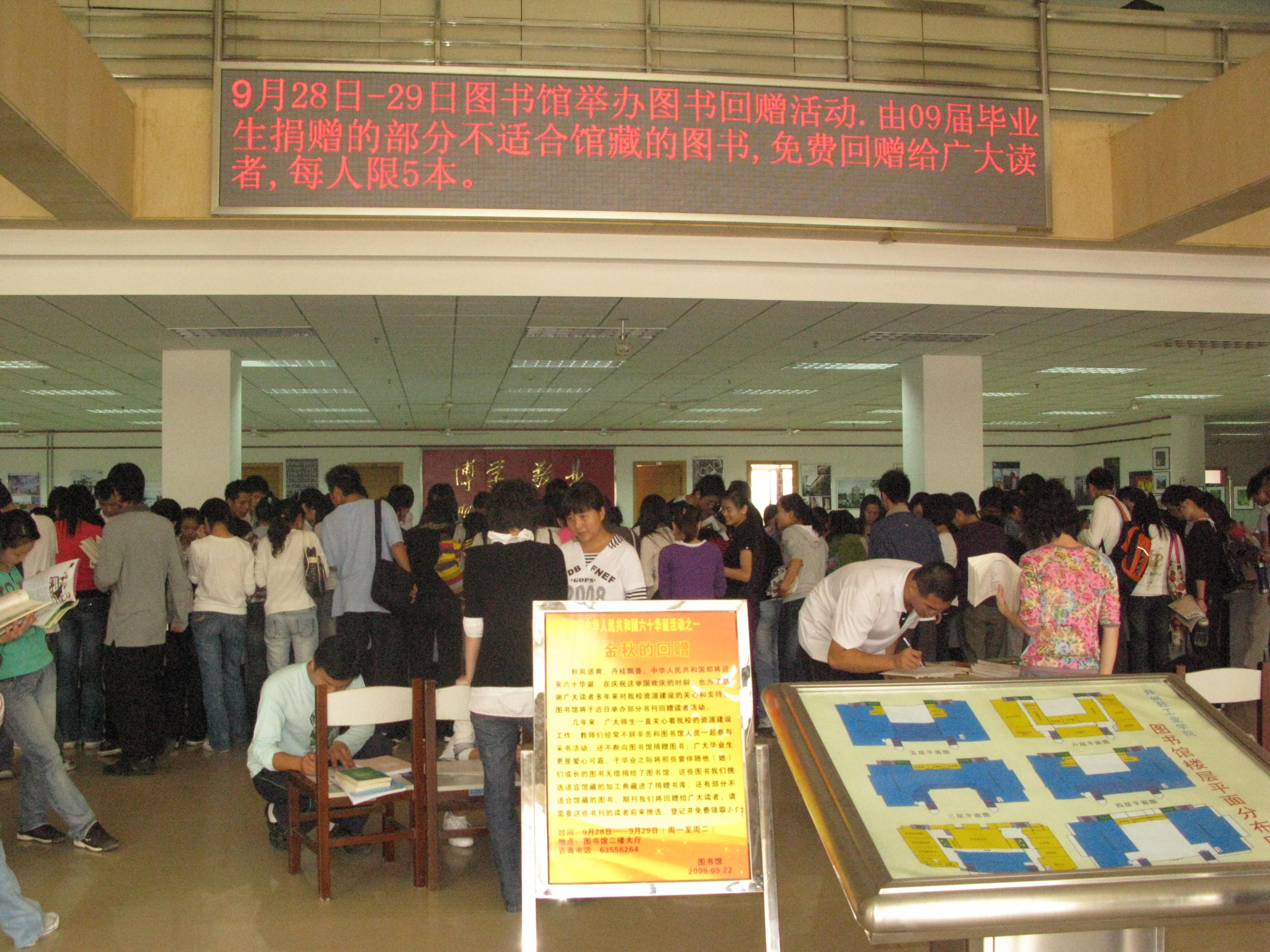 为庆祝中华人民共和国六十华诞,回馈读者对图书馆资源建设的关心和支持,传递知识,传递爱心,倡导大学生树立知校、爱校、荣校的精神,营造一种相互关心、和谐融洽,多读书、读好书的校园文化氛围。图书馆于2009年9月28日,在二楼大厅成功举办了书刊回赠活动。这些书刊是09年毕业生捐赠图书的一部分,由于捐赠的杂志和部分图书不适合入馆藏,图书馆将它们挑选出来回赠了读者。