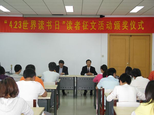 颁奖仪式上,朱副馆长首先向大家介绍了此次征文活动的投稿情况和稿件评审情况,宣布了获奖名单。王馆长为一、二等奖的获奖读者颁发了获奖证书、征文集和奖品。最后,王馆长做了总结发言,他从“世界读书日”的由来谈到国内外开展读书活动的情况,并介绍了我校图书馆近年来“全民阅读活动” 开展情况及取得的成绩。最后王馆长援引国务院总理温家宝在4月23日“世界读书日”和读者交流时的讲话与大家共勉,他希望大家不仅仅在 “世界读书日”和“读书月”期间读书,而是要终生读书,提倡“读书好、好读书、读好书”,同时希望有更多的读者参与图书馆举办的各种读书活动,共同营造浓郁的校园文化氛围。