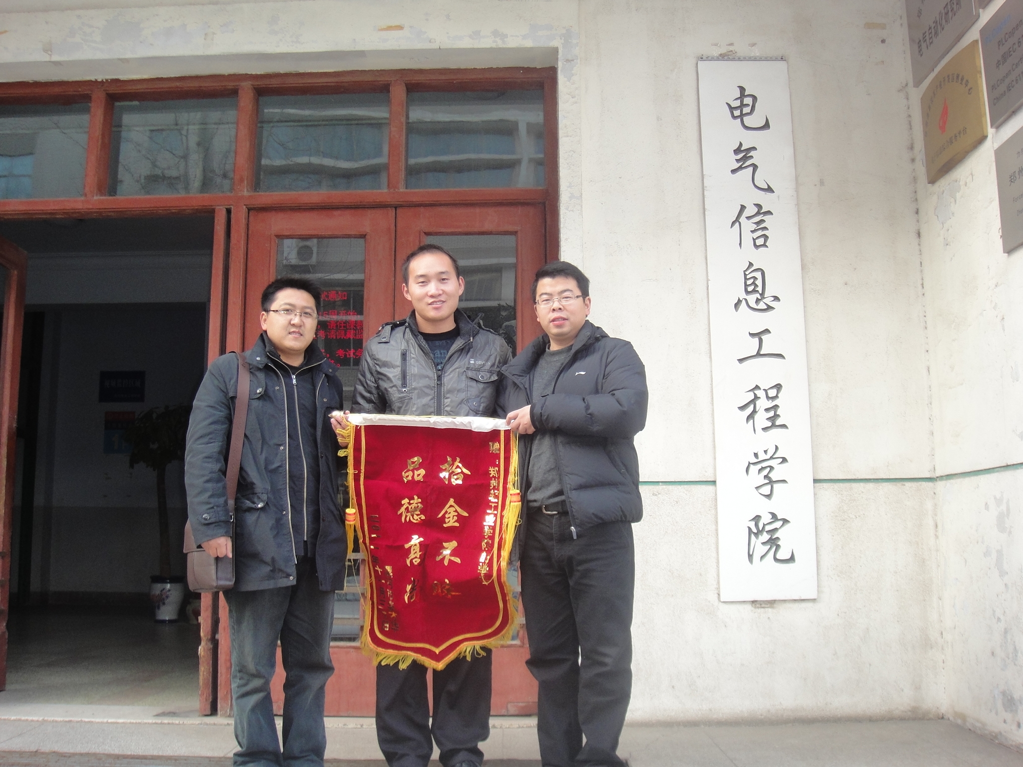 2011年11月27号上午,来自电气信息工程学院自动化09-1班的霍城辉同学在从学校到宿舍的路上捡到一个钱包,装有现金若干元、银行卡、身份证、驾驶证及其他有效证件。霍城辉同学立即将其交到宿舍管理处,几经周折终于与失主取得了联系,并将钱包归还失主。失主万分感激,11月30日下午专程到学院办公室送“拾金不昧,品德高尚”锦旗一幅来表达他的感激之情。