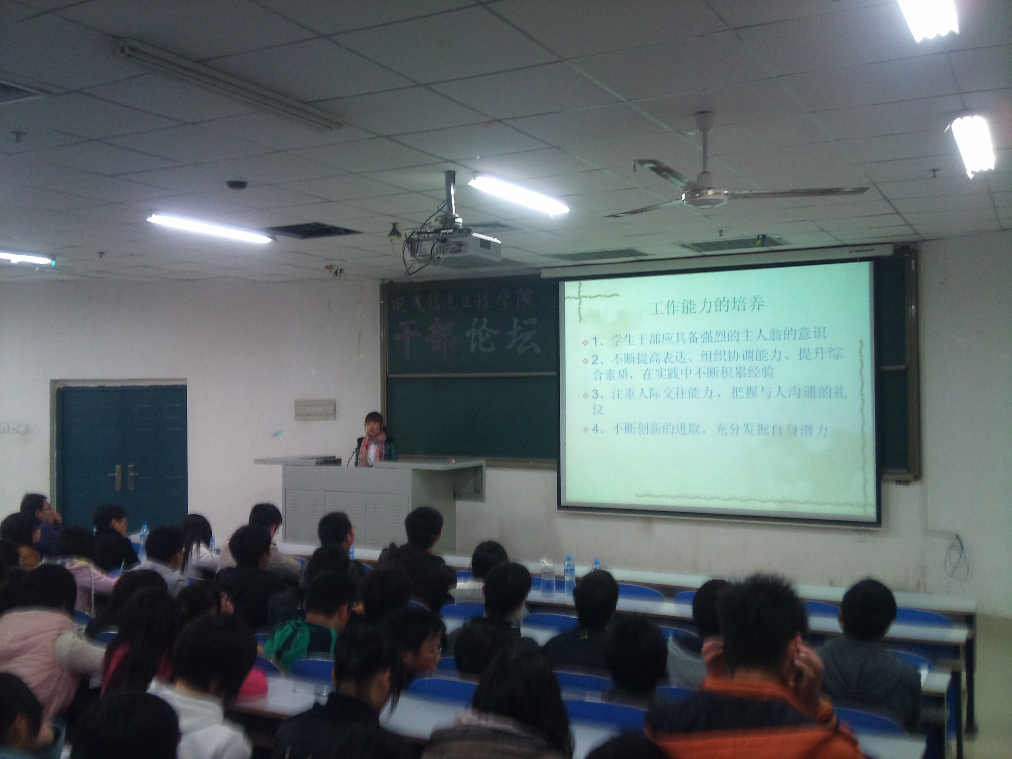 2011年11月10日下午2:30,电气信息工程学院在科学校区电教楼108举办第三届学生干部论坛,2011级的学生会成员、班委和宿舍长参加论坛。