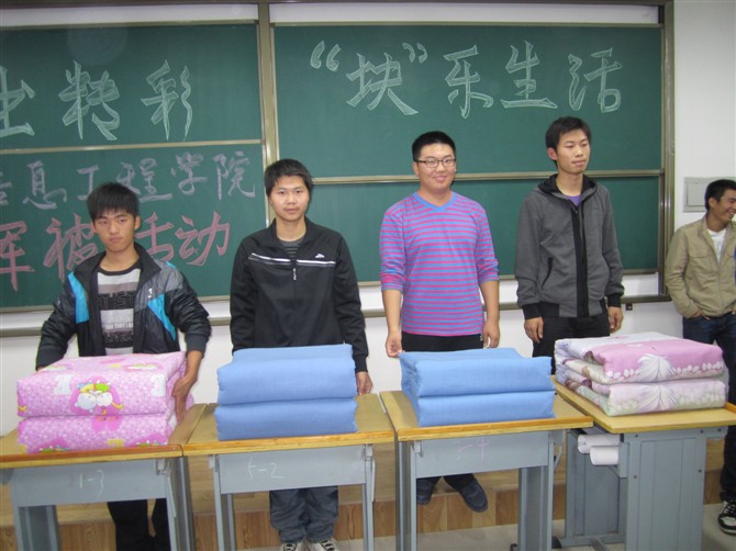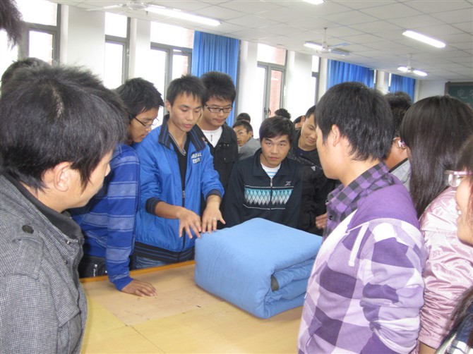 10级“优秀个人”代表首先就寝室内务整理标准、叠军被技巧等进行了讲解,而后10级“优秀个人”代表分到各组,现场演示叠军被的技巧,回答11级同学们的提问。最后11级同学们亲自动手进行叠军被练习,并由各专业分别推选出一名代表进行叠军被比赛,将活动气氛推至活动高潮。活动结束,同学们合影留念,活动在同学们的笑声中圆满落下帷幕。