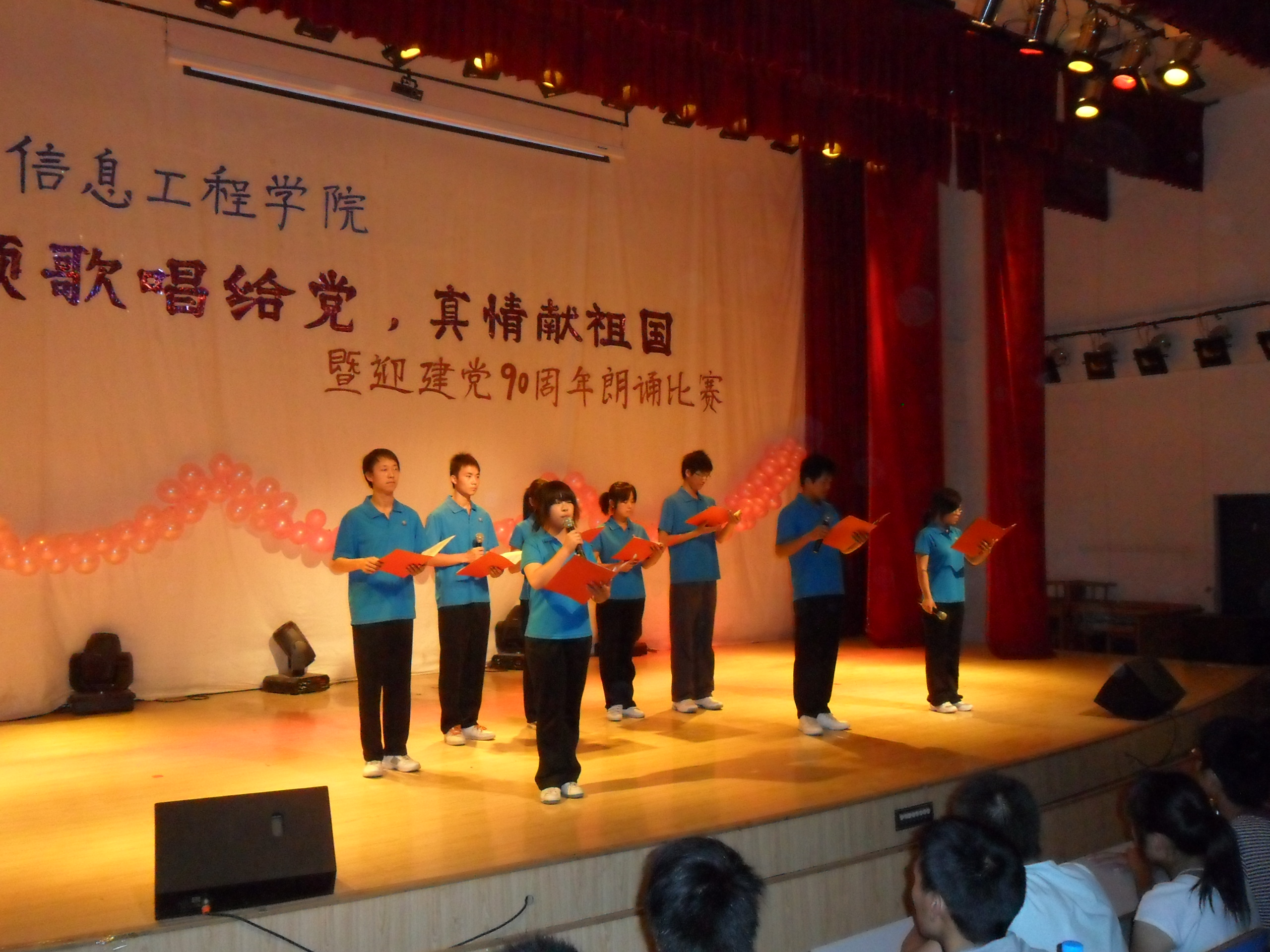 值建党九十周年之际,为加强当代青年大学生的思想政治教育,正确抒发同学们爱党爱国之情,为党的生日献礼,5月15日下午,电气信息工程学院在科学校区电教楼208举办了“颂歌唱给党,真情献祖国――暨迎建党九十周年朗诵比赛”。比赛分为独诵和合诵两部分,2010级各班组成14支队伍参赛。电气学院辅导员老师出席比赛并担任评委。