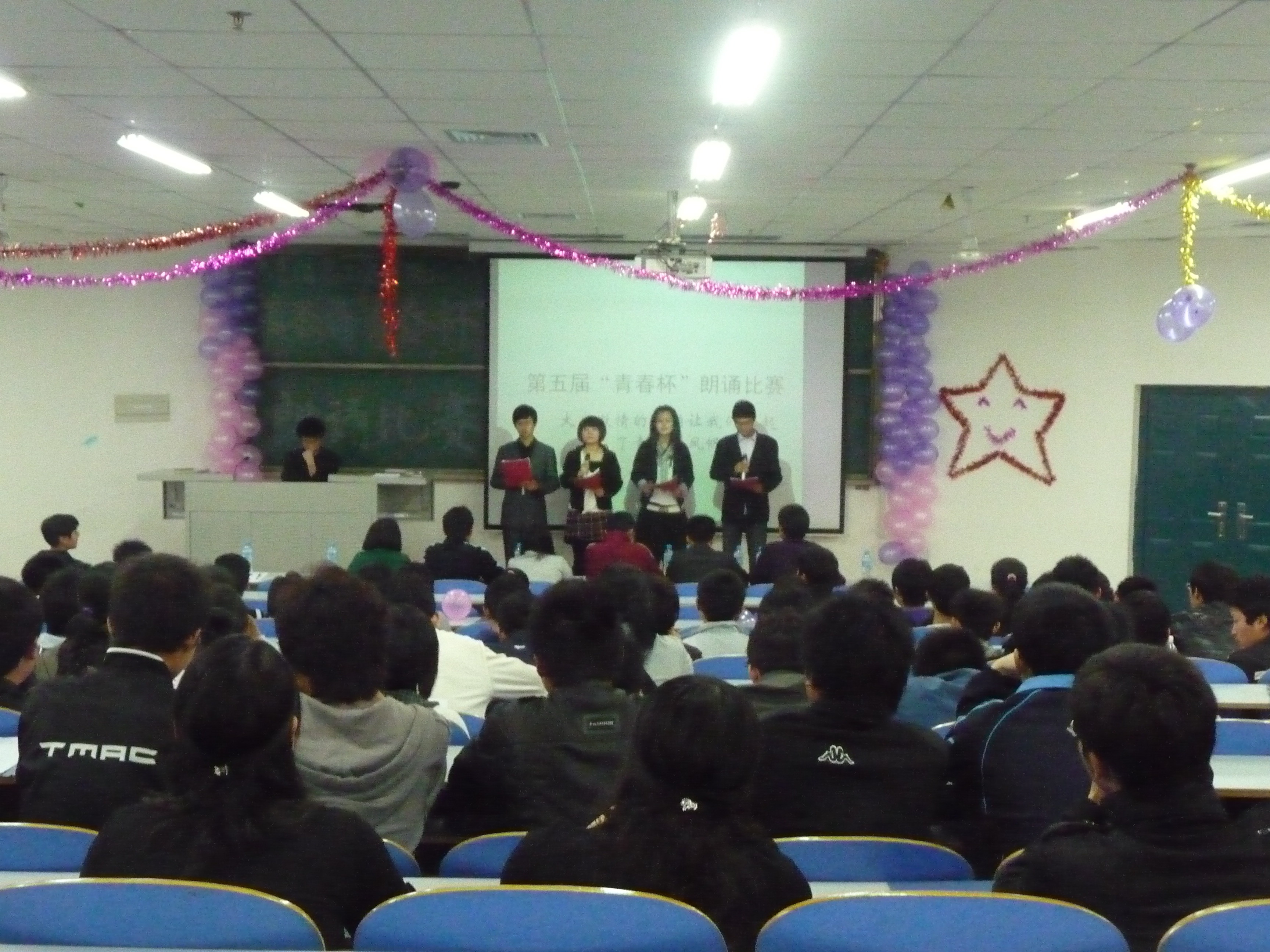 本次朗诵比赛以“绽放青春,展现自我”为主题,分为独诵和合诵两部分,09级各班级组成14支队伍参赛。活动过程中选手们感情饱满真挚,声情并茂,以其独特视角解读青春,为广大观众奉上了一道道精神大餐。选手们以个人的抑扬顿挫、充满感染力的朗诵博得了阵阵掌声,现场气氛十分活跃,同学们身心得到放松的同时,精神上也得到了陶冶。