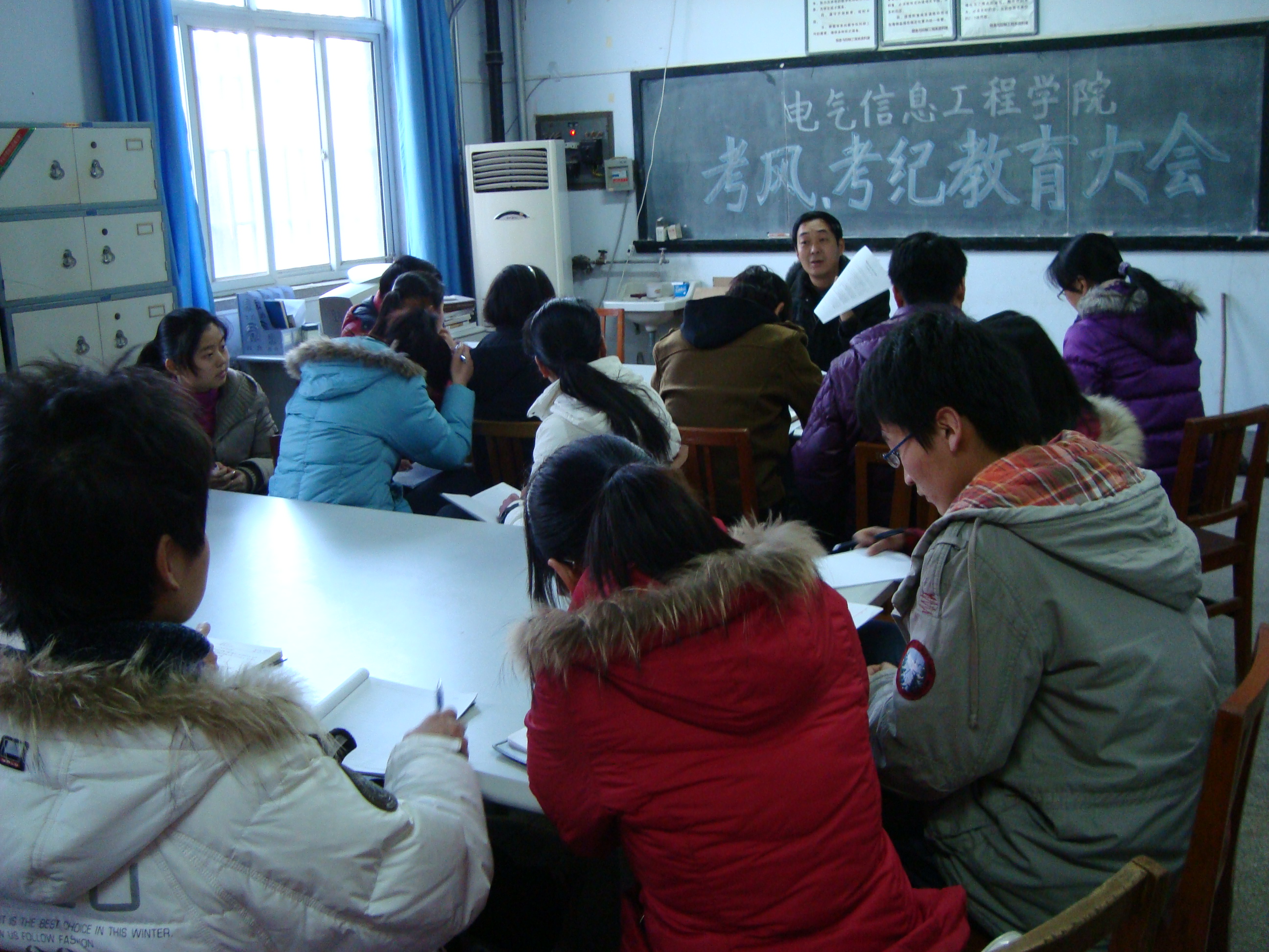 为严肃考风考纪,树立优良学风,2010年1月14日下午3点,电气信息工程学院在系资料室召开了本学期考风考纪教育大会,电气信息工程学院党总支副书记刘吉彬老师、各年级辅导员以及各班级学生干部参加了此次大会。