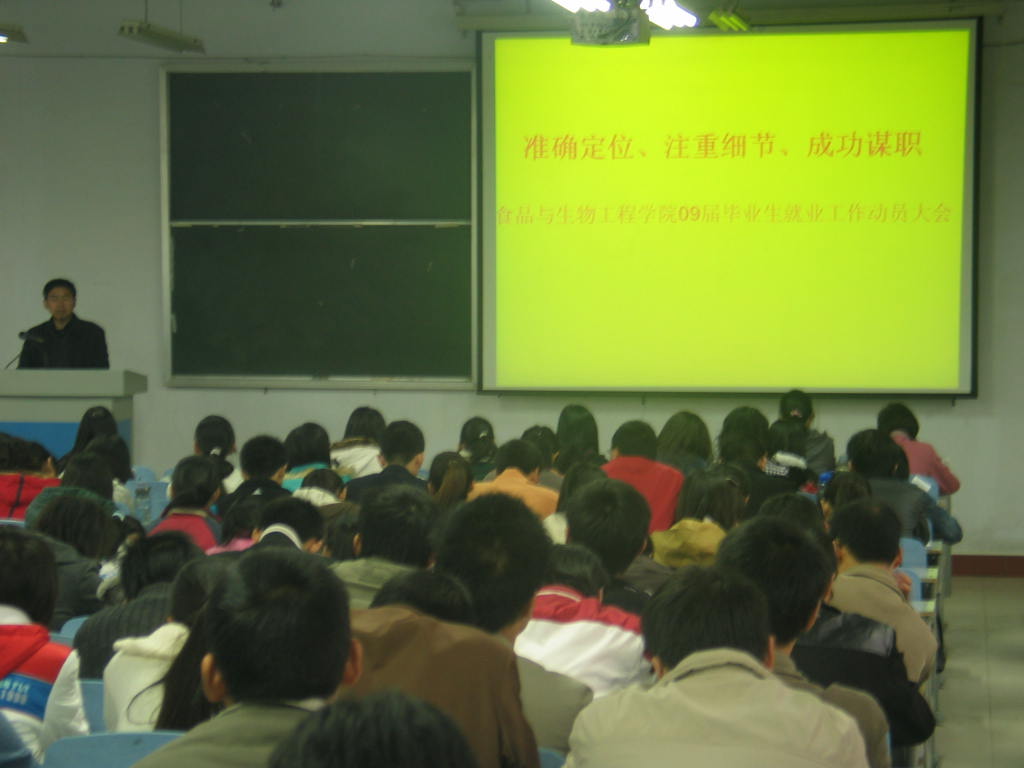 为了让毕业生了解09年就业工作的新形势,加强对毕业生的就业指导和今后一段时间的安全教育,食品与生物工程学院于11月12日下午16:30在西五楼314多媒体教室召开05级全体毕业生工作动员大会,05级全体毕业生、院党总支吴占超副书记、学工办副主任尚金清老师和毕业班辅导员参加了会议。