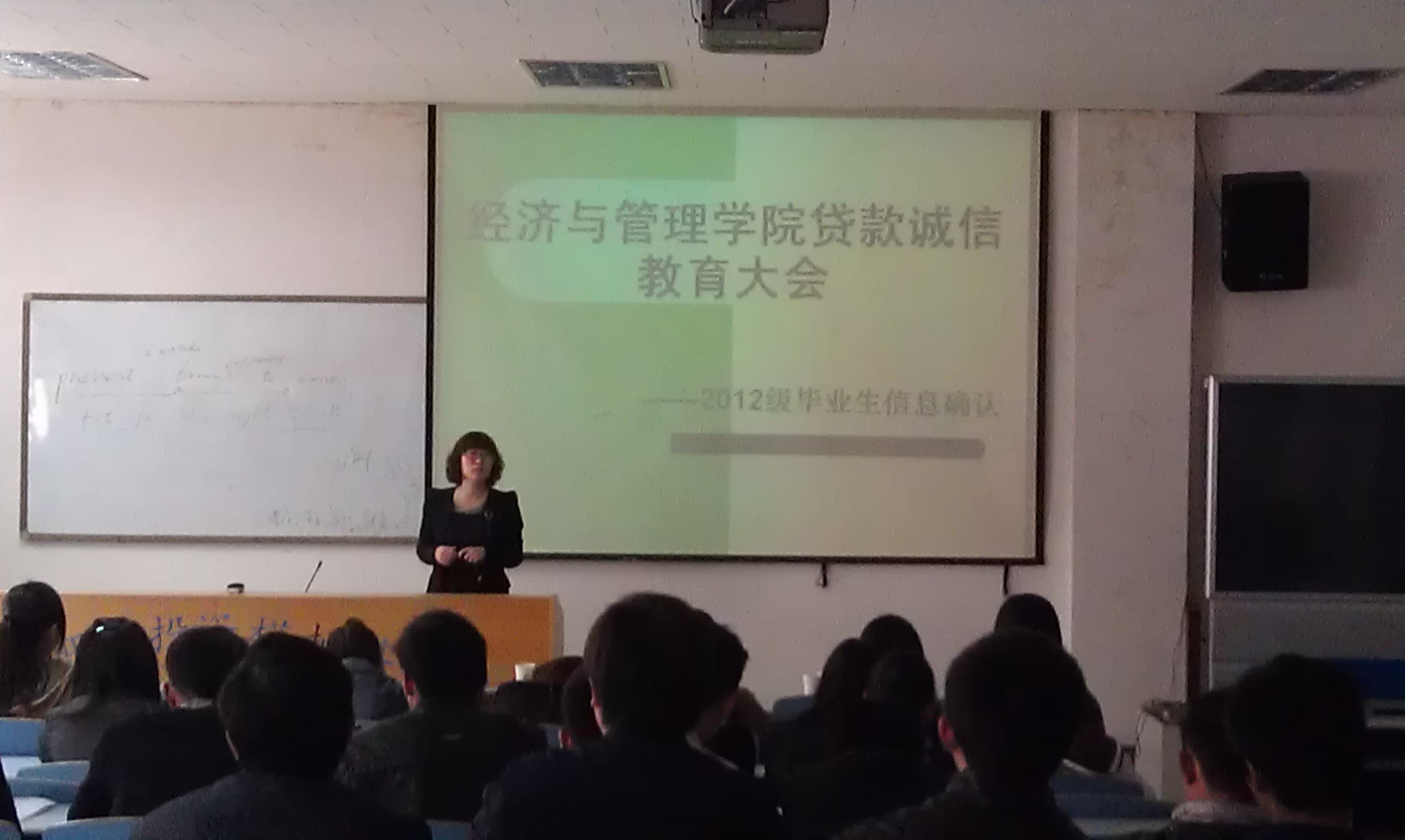 为了使贷款学生更好的树立正确还款观念,进一步防范贷款违约风险,提高毕业生对助学贷款政策的认识和诚信意识,2012年4月13日上午,经济与管理学院在东一楼118教室召开2012届贷款毕业生信息确认及诚信教育大会,党总支副书记刘洪民、负责贷款的辅导员姚少华、王静和2008级90名贷款毕业生参加了会议。
