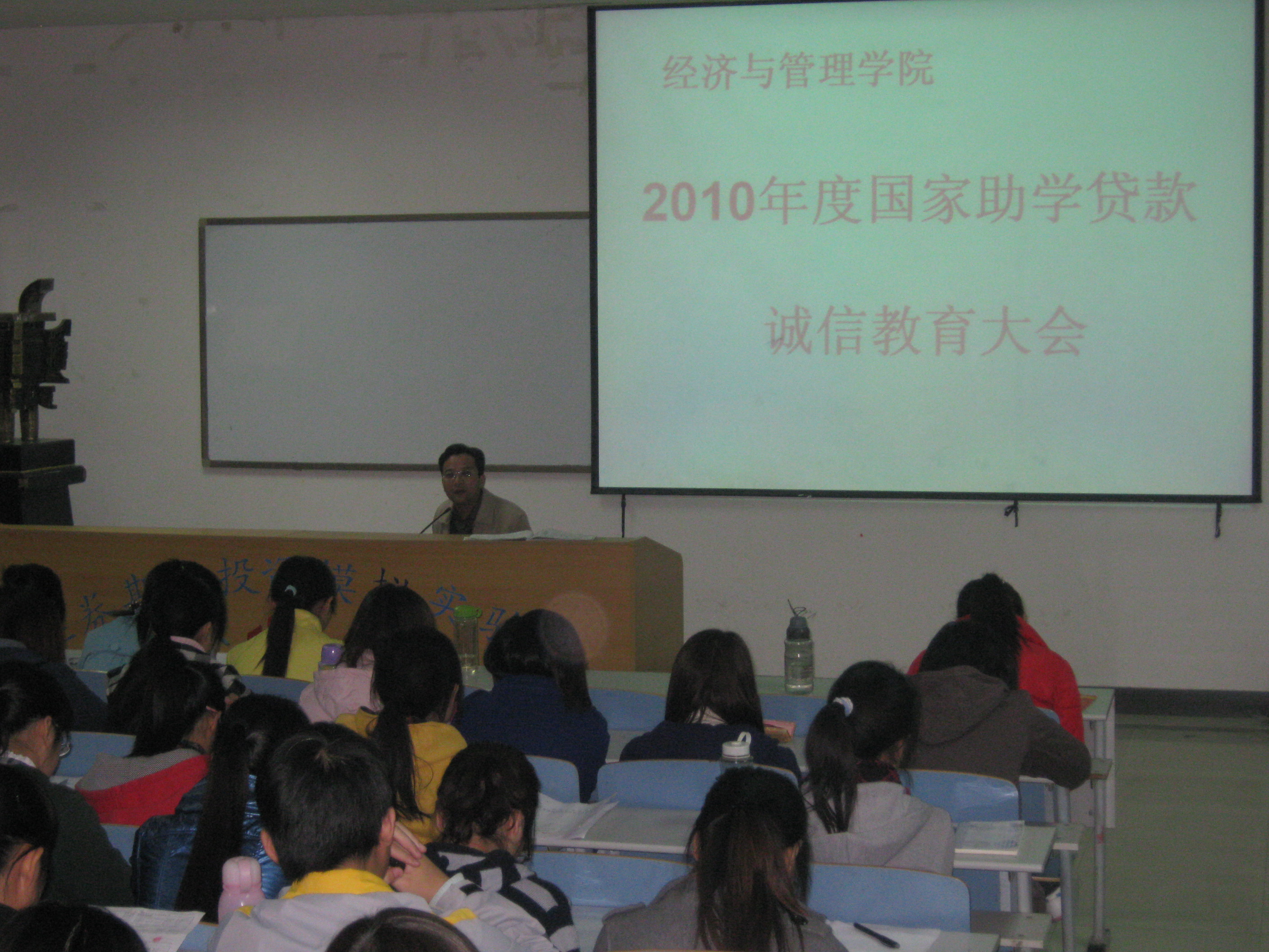 10月28、29日,经济与管理学院分别在东风校区东一楼118室、科学校区电教楼108室召开2010年度国家助学贷款诚信教育大会暨合同签订仪式。党总支副书记刘洪民、分团委老师姚少华、宋正凯以及2010年度全体贷款学生参加了会议。