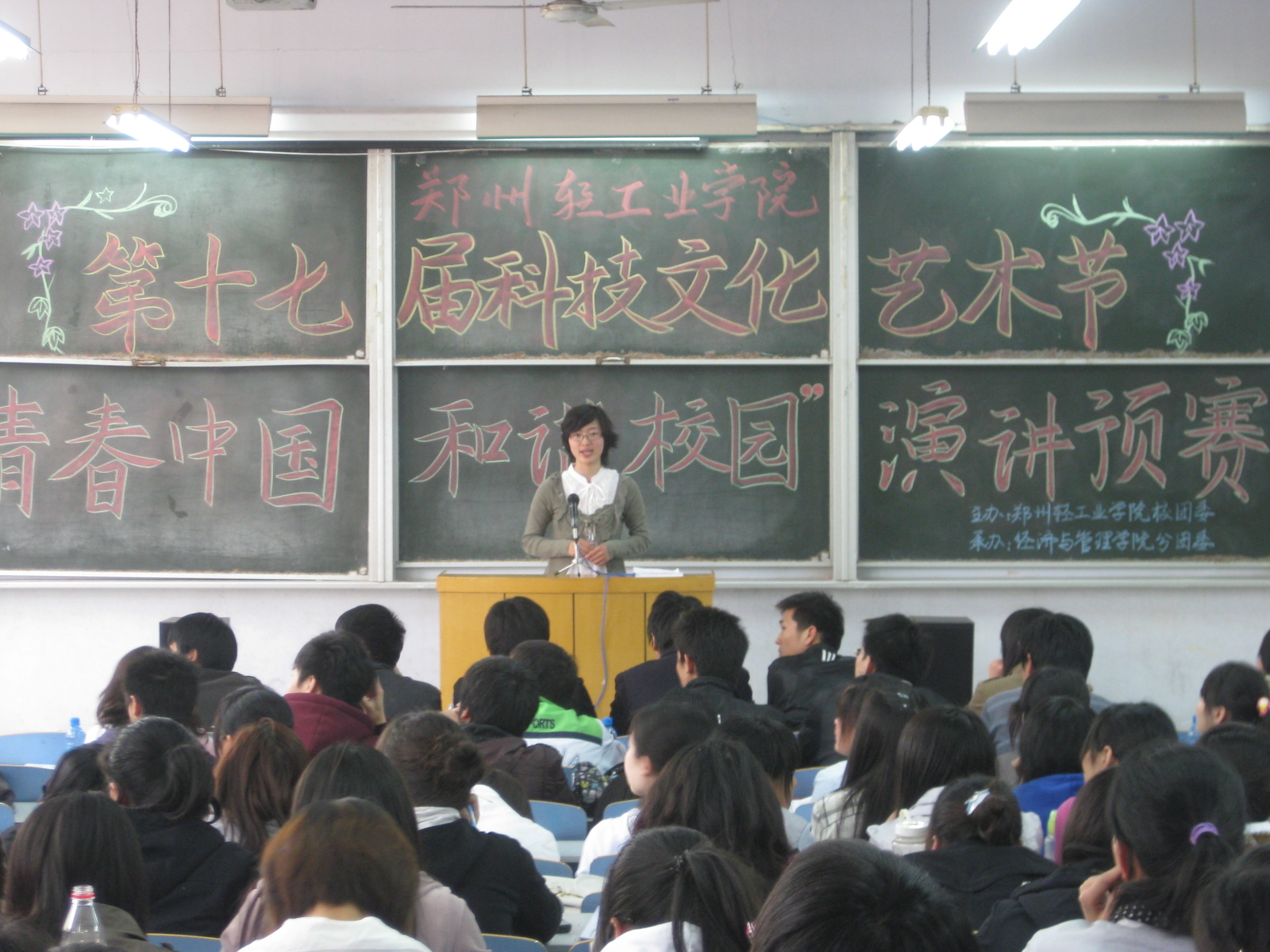 为了引导青年学生时刻心系祖国发展,积极参与和谐校园建设,充分展现青年学生的时代风采和精神风貌,4月22日下午3:00,由校团委主办、经济与管理学院承办的我校第十七届科技文化艺术节之“青春中国,和谐校园”演讲比赛预赛在东风校区东一楼218成功举办。
