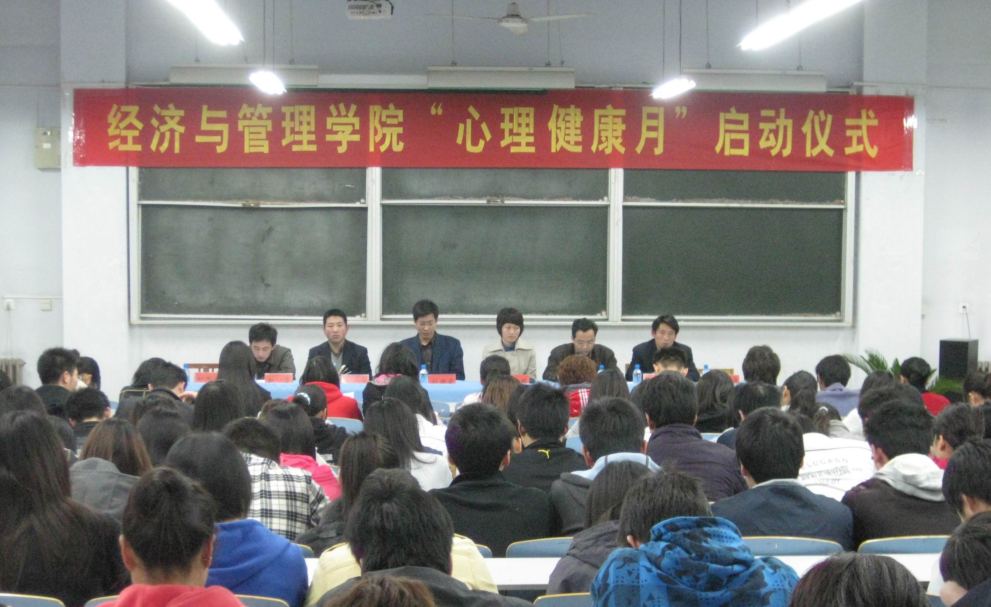 为深入贯彻落实科学发展观,全面开展我院学生心理健康教育工作,创新我院心理健康教育的形式和内容,进一步宣传、普及心理健康知识,在全院范围内营造心理健康教育的良好氛围,4月1日下午,经济与管理学院“心理健康月”启动仪式在东一楼218隆重举行。经济与管理学院党总支书记刘国豪、学生处副处长蒋玮、校团委副书记高建奇、经济与管理学院党总支副书记刘洪民、校心理健康教育中心赵奇以及经济与管理学院分团委、学工办负责人出席了仪式,200多名学生与会,仪式由刘国豪主持。