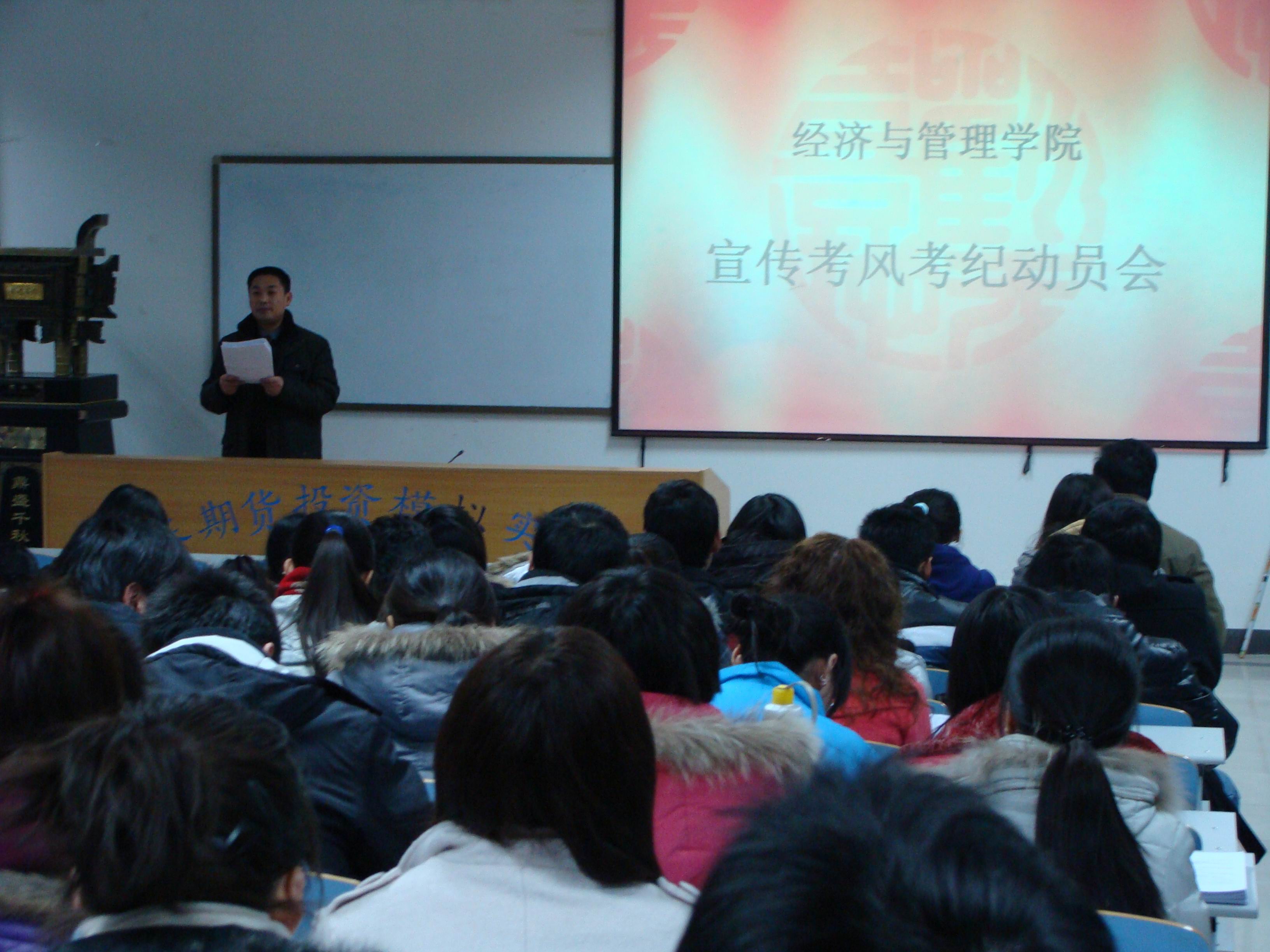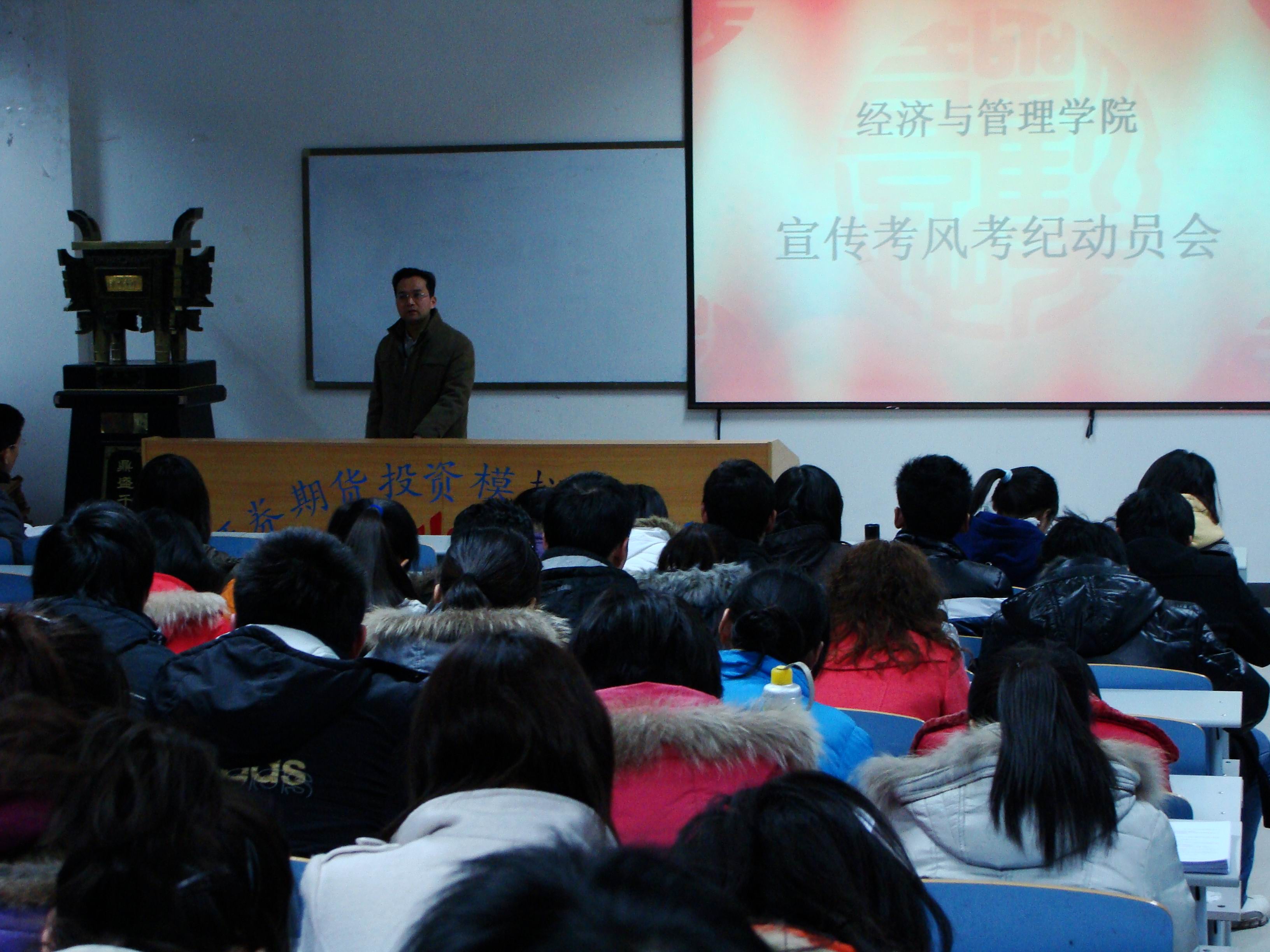 为加强考风考纪,净化考试环境,营造良好的考试氛围,1月7日和15日,经济与管理学院分别在科学校区和东风校区召开了期末考试考风考纪动员大会。经济与管理学院党总支书记刘国豪、副书记刘洪民、副院长周广亮、专兼职辅导员以及各班学生干部、党员参加了会议。