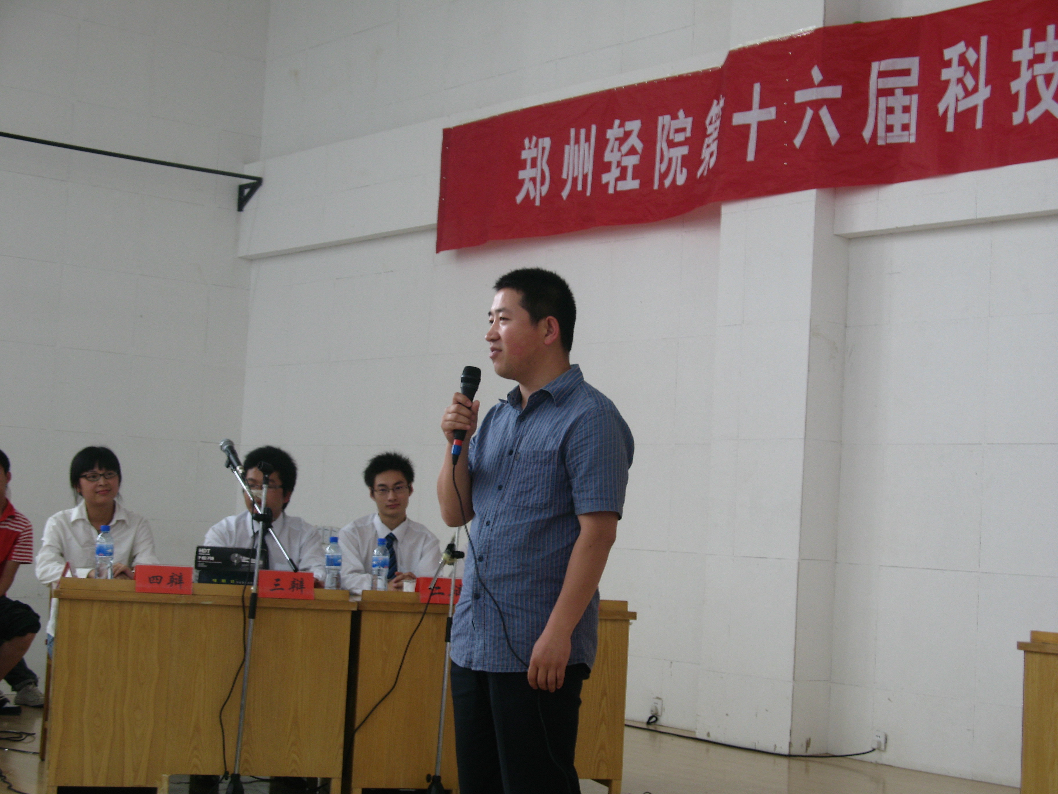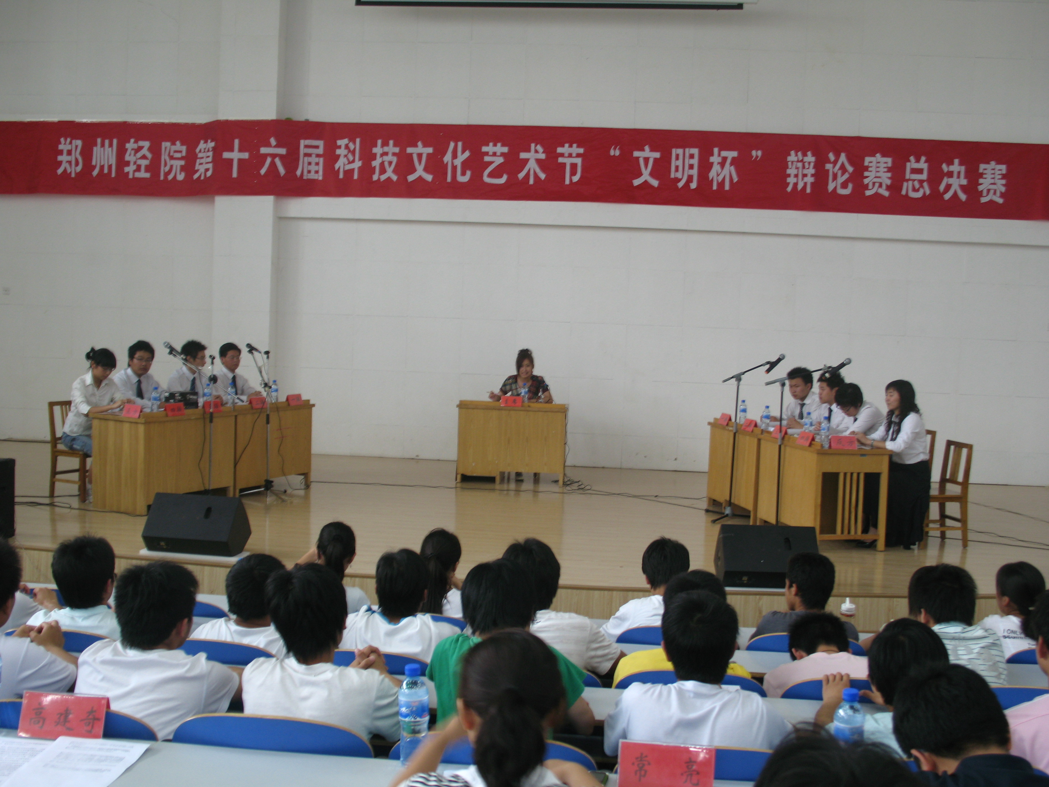 为了纪念建国六十周年,激发广大学生的爱国之情、报国之志,增强当代大学生的历史使命感和社会责任感,5月21日下午2:30,由校团委主办、经济与管理学院承办的以“纪念建国六十周年,弘扬爱国主义精神”为主题的第十六届科技文艺术节“文明杯”辩论赛总决赛在科学校区电教楼208室隆重举行。