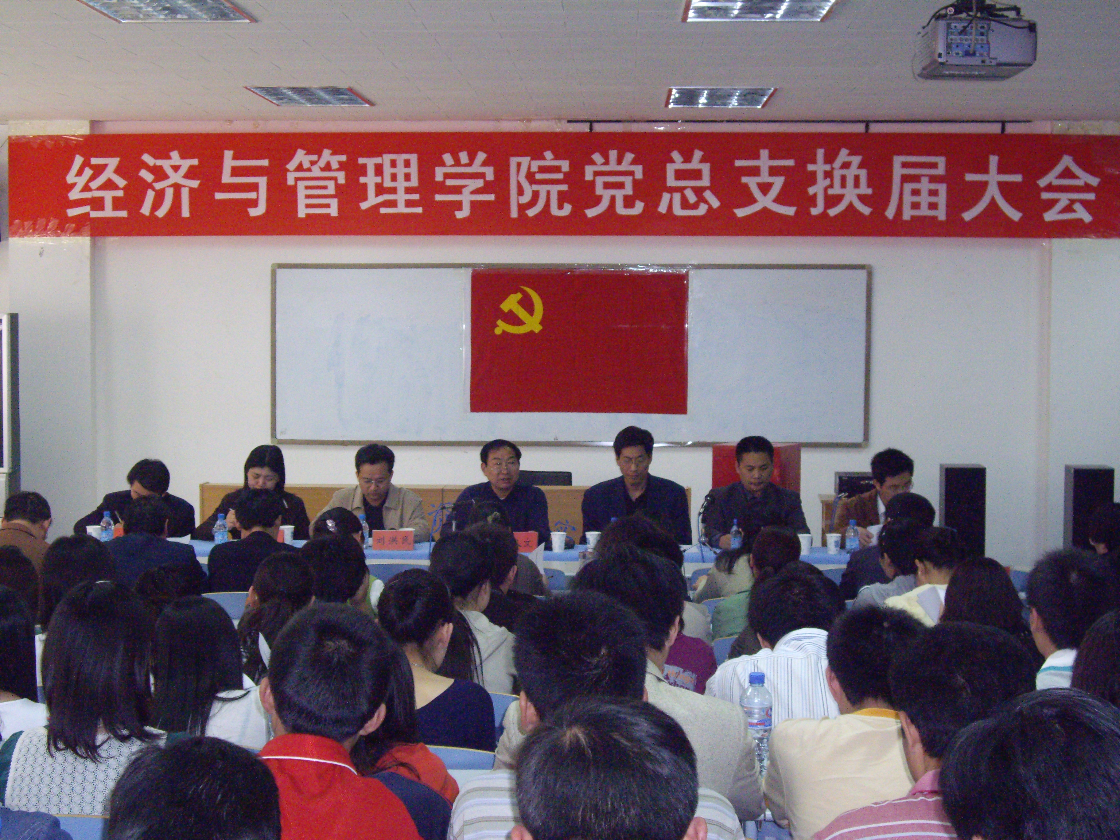 按照学校党委《关于党总支(直属党支部)委员会换届选举工作的通知》安排,经过精心组织,经济与管理学院党总支于2008年4月25日下午3:00在东一楼118室隆重召开了换届大会。校长剧乂文教授出席会议。民主党派、教授、博士、系主任列席会议。大会由经济与管理学院副院长周广亮同志主持。