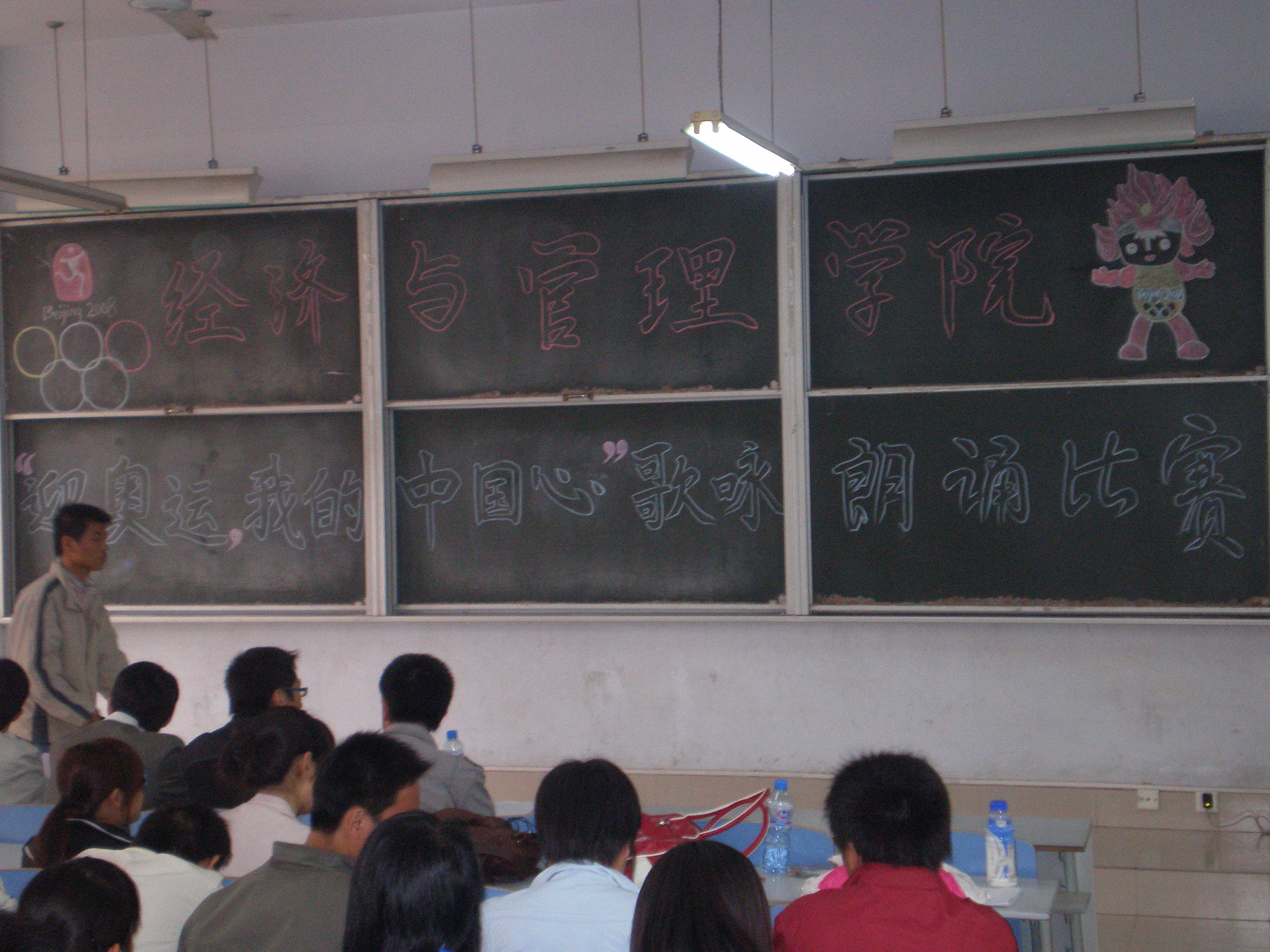 为纪念改革开放三十周年,喜迎奥运会,弘扬爱国主义精神,丰富同学们的课余文化生活,4月12日下午,经济与管理学院在东一楼218教室举办了“迎奥运・我的中国心”歌咏比赛。