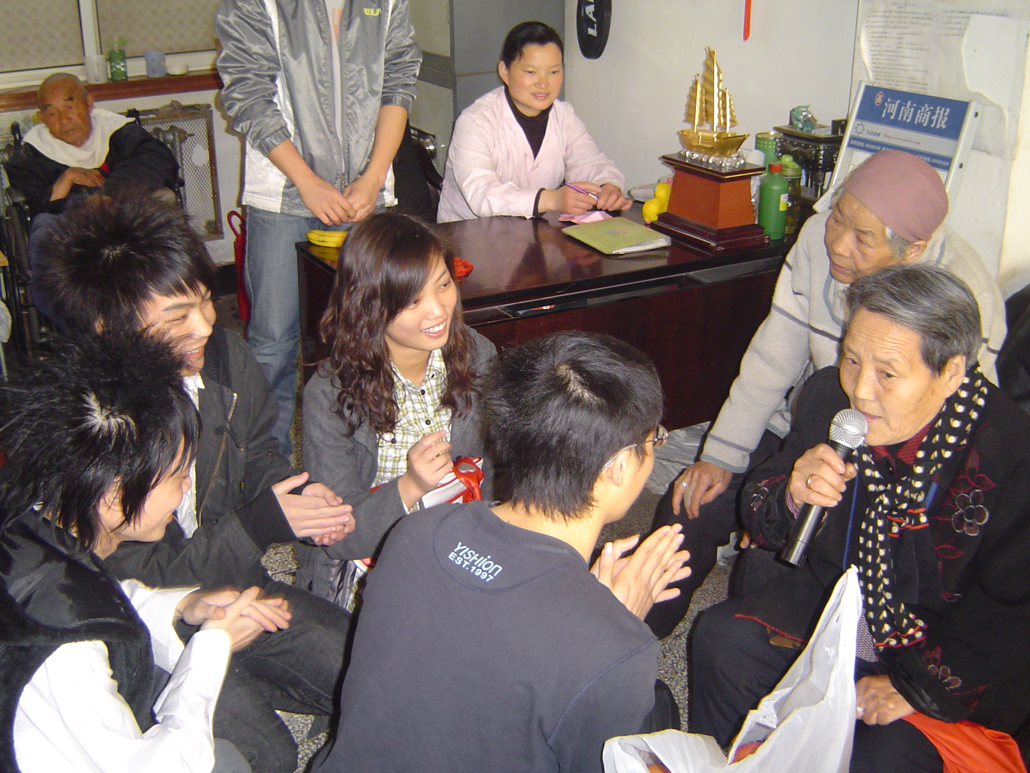 同学们一到敬老院就立刻开始忙碌起来,擦桌子、拖地、整理被褥,耐心照顾活动不便的老人,与老年人亲切地拉家常,听他们讲自己的人生经历和革命故事。同时,同学们为老年人演唱了《精忠报国》、《当那一天来临》、《军中绿花》等十几首传统革命歌曲,同学们深情的演唱深深打动了老年人,他们也鼓起勇气,拿起麦克风,亮出自己的绝活,先后演唱了豫剧《花枪缘》选段、《窦娥冤》选段、《朝阳沟》选段、《李双双》选段等,整个活动大厅充满了欢乐、融洽、祥和的气氛,老年人眼中都充满了幸福的目光,歌声、笑声、掌声,经久不息…