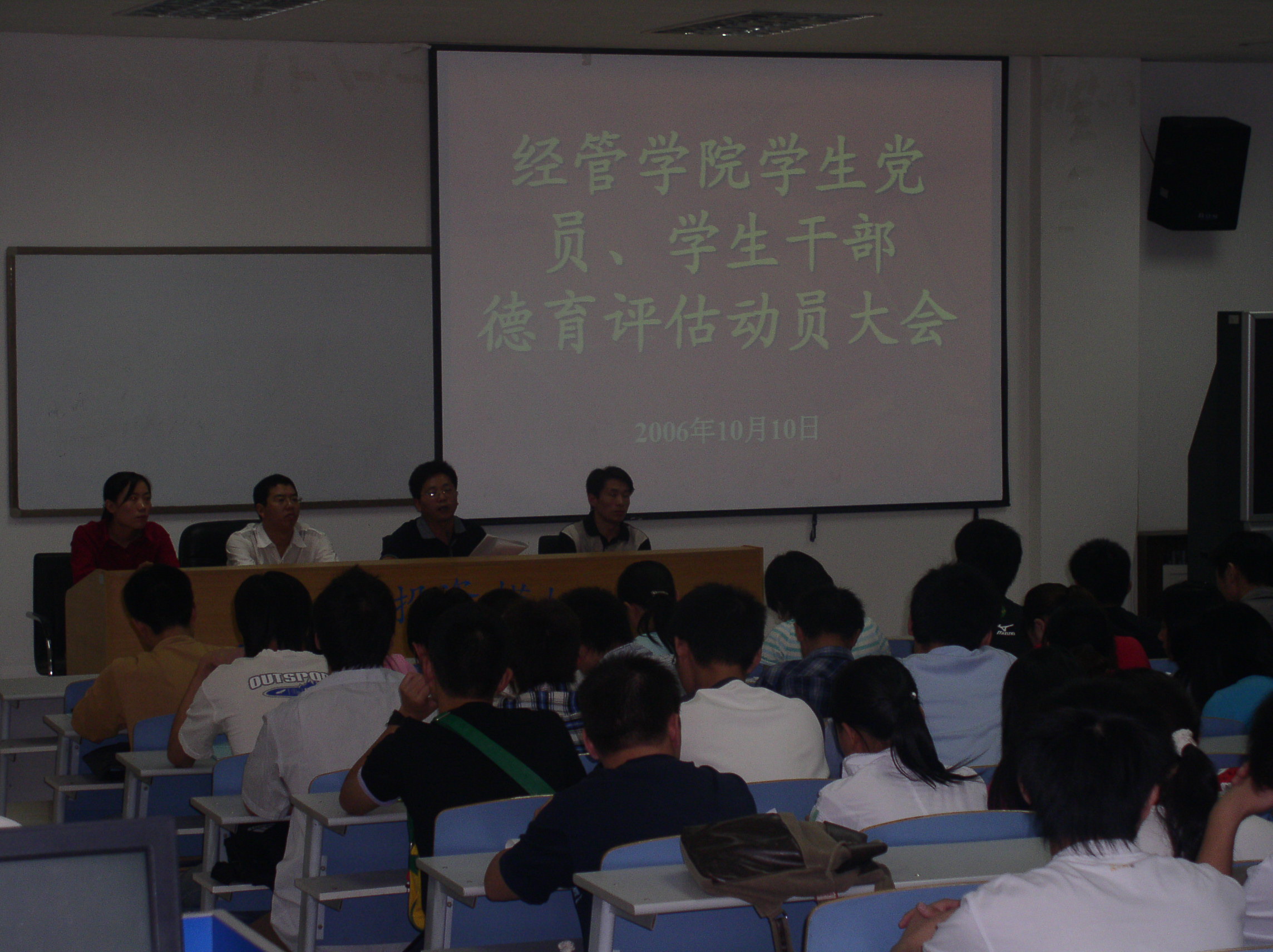 为进一步统一思想、提高认识、明确任务,充分发挥学生党员、学生干部在德育评估工作中的积极作用,经管学院于10月10日中午在东一楼118召开了学生党员、学生干部德育评估动员大会。经管学院学生党员、学生会干部、年级团总支干部以及各班班长、团支书参加了会议。会议由经管学院党总支副书记于善启老师主持。