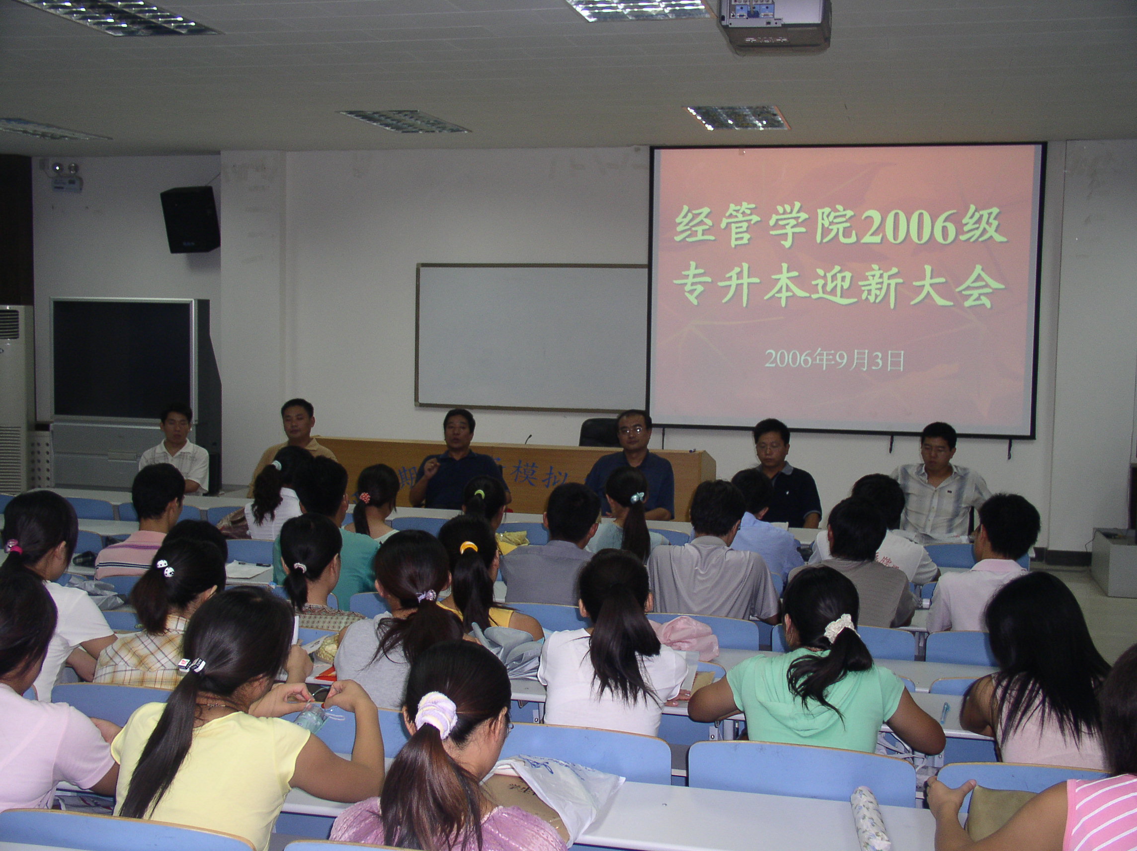 9月3日下午15:00,经管学院在东一楼118举行2006级专升本迎新大会。经管学院党总支韩庆林书记、于善启副书记、管洲副院长、周广亮副院长以及分团委的相关老师参加了会议。