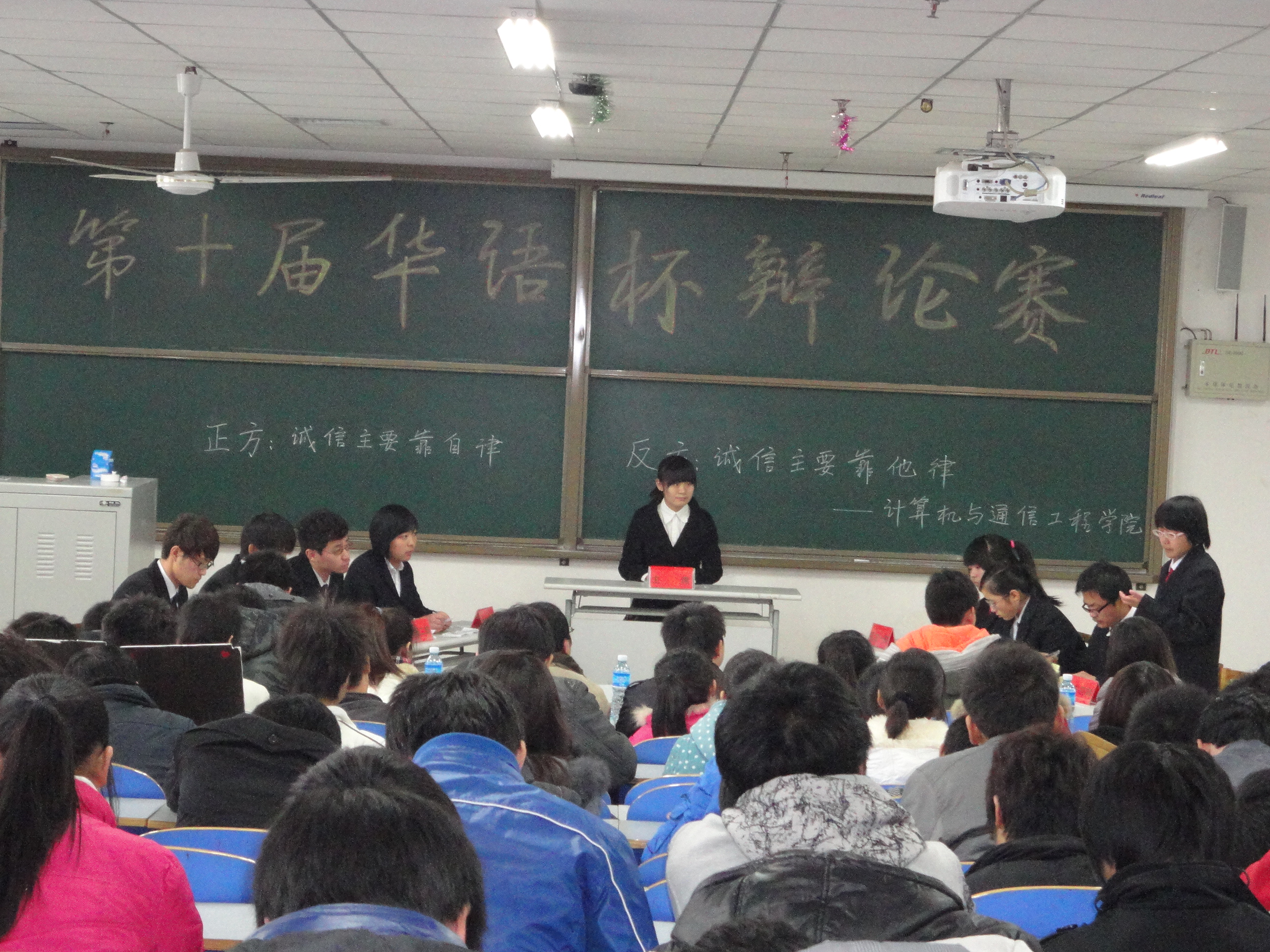 本届华语杯辩论赛经过初赛、复赛、半决赛和决赛等共14场比赛。决赛赛场上,:正方为物联网技术11-02班代表队,持观点为“诚信主要靠自律”;反方为信息工程11-01班代表队。持观点为“诚信主要靠他律”正反双方围绕辩题展开了激烈的争论。在各个环节中双方辩友以严谨的逻辑,活跃的思维,渊博的知识,以及良好的气质风度赢得了评委以及观众的阵阵掌声。赛后,分团委宋文军老师作为点评嘉宾,指出了双方辩手各自的优点与不足之处,并号召同学们发扬12.9运动精神,诚信做人。最终,物联网技术11-02班凭借严谨的思维逻辑获得了本次比赛的冠军。信息工程11-01班董春晓荣获“最佳辩手”称号。