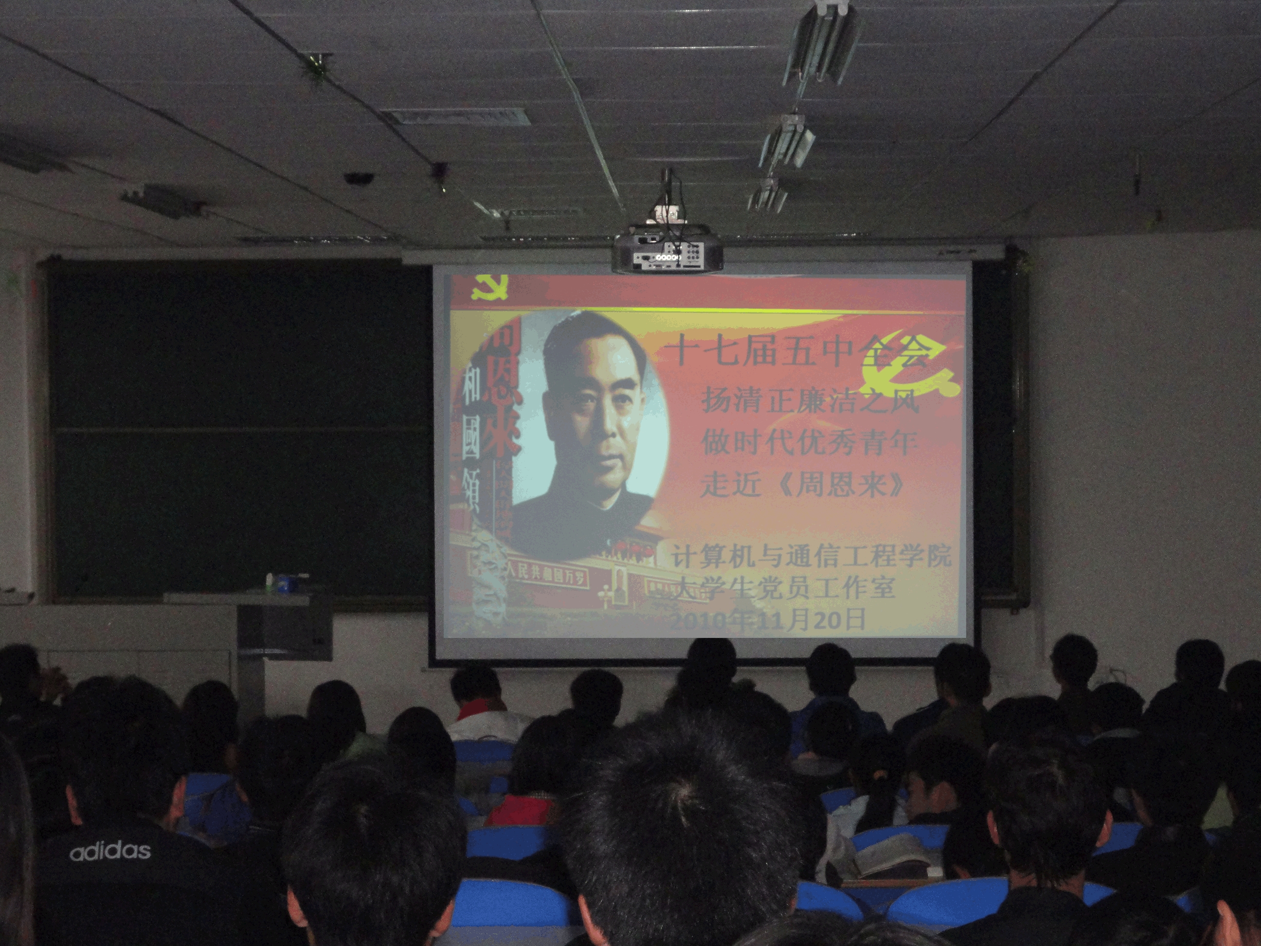 2010年11月20日晚,计算机学院大学生党员工作室在科学校区电教楼109教室举办了以“扬清正廉洁之风,做时代优秀青年”为主题活动,组织我院大一新生和09级入党积极分子观看了爱国教育片走近《周恩来》。