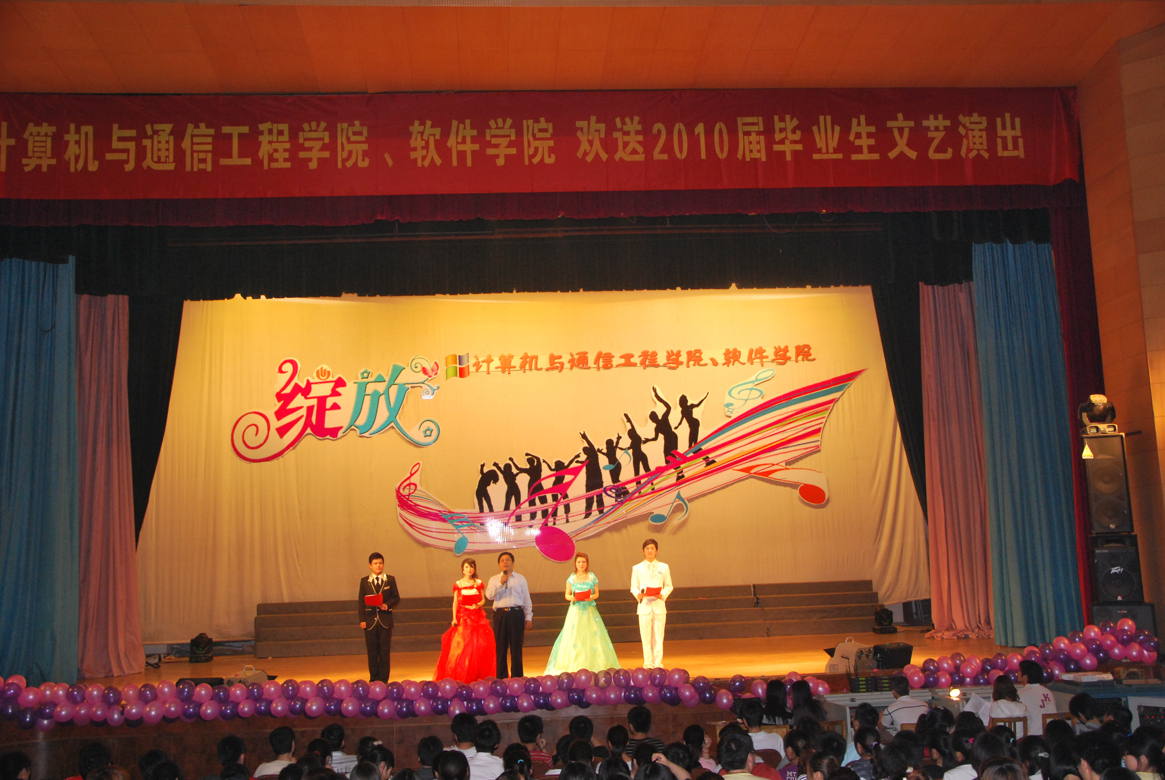 下午,计算机与通信工程学院(软件学院)在校礼堂成功举办欢送2010届毕业生文艺演出,用一场歌舞盛宴为毕业生送上一份华美的告别。校党委副书记张胜利教授、党委学工部部长胡恩立老师,研究生处党总支书记张建伟老师、计算机与通信工程学院(软件学院)全体党政领导、系(中心)主任、辅导员、专业教师、各年级学生代表、毕业班同学们和部分学生家长和校友观看了本场演出,会场座无虚席。