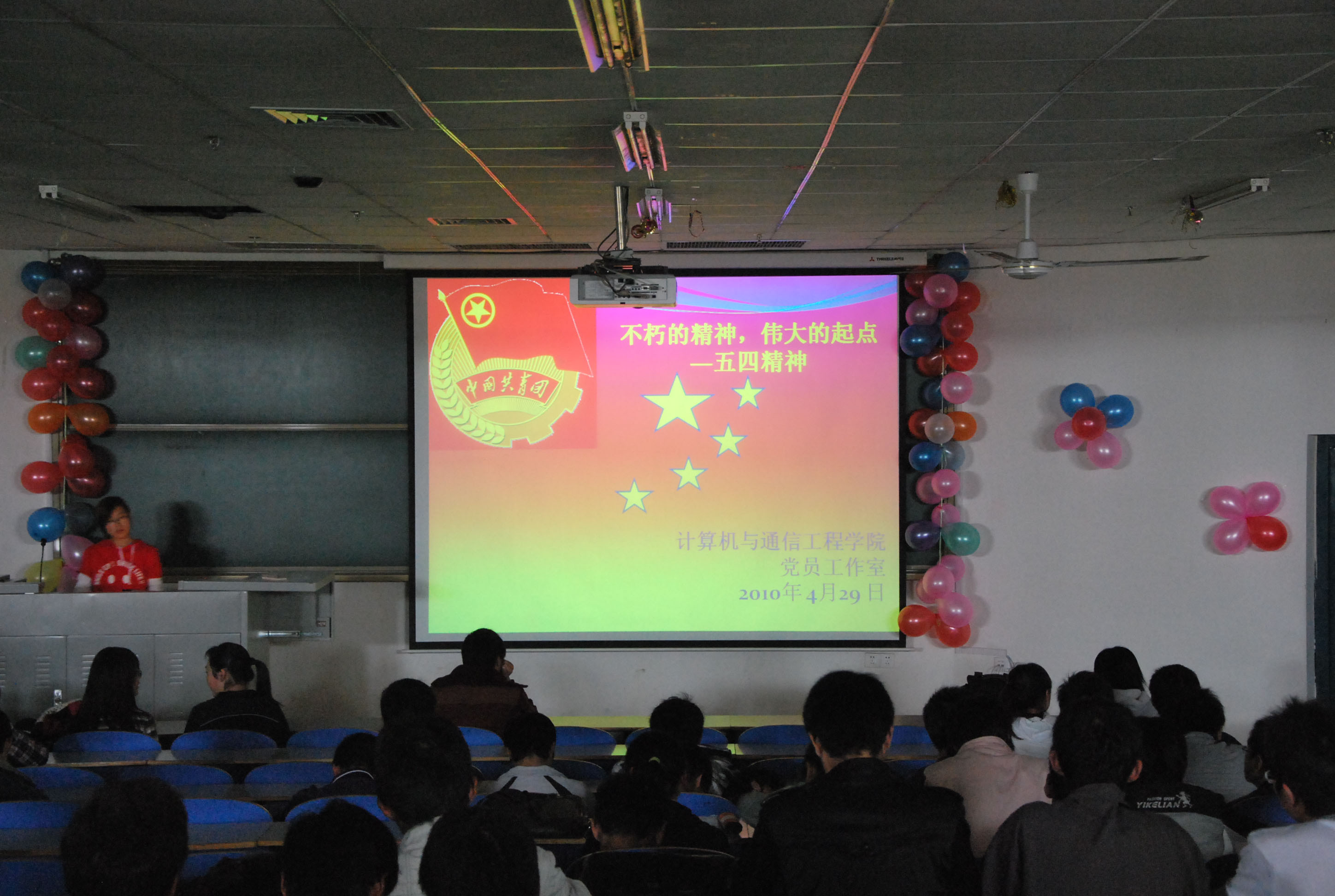 4月29日下午,计算机与通信工程学院大学生党员工作室在科学校区电教楼108教室举办题为“不朽的精神,伟大的起点――五四精神”爱国主义教育活动,计算机与通信工程学院09级全体学生参加了此次活动。