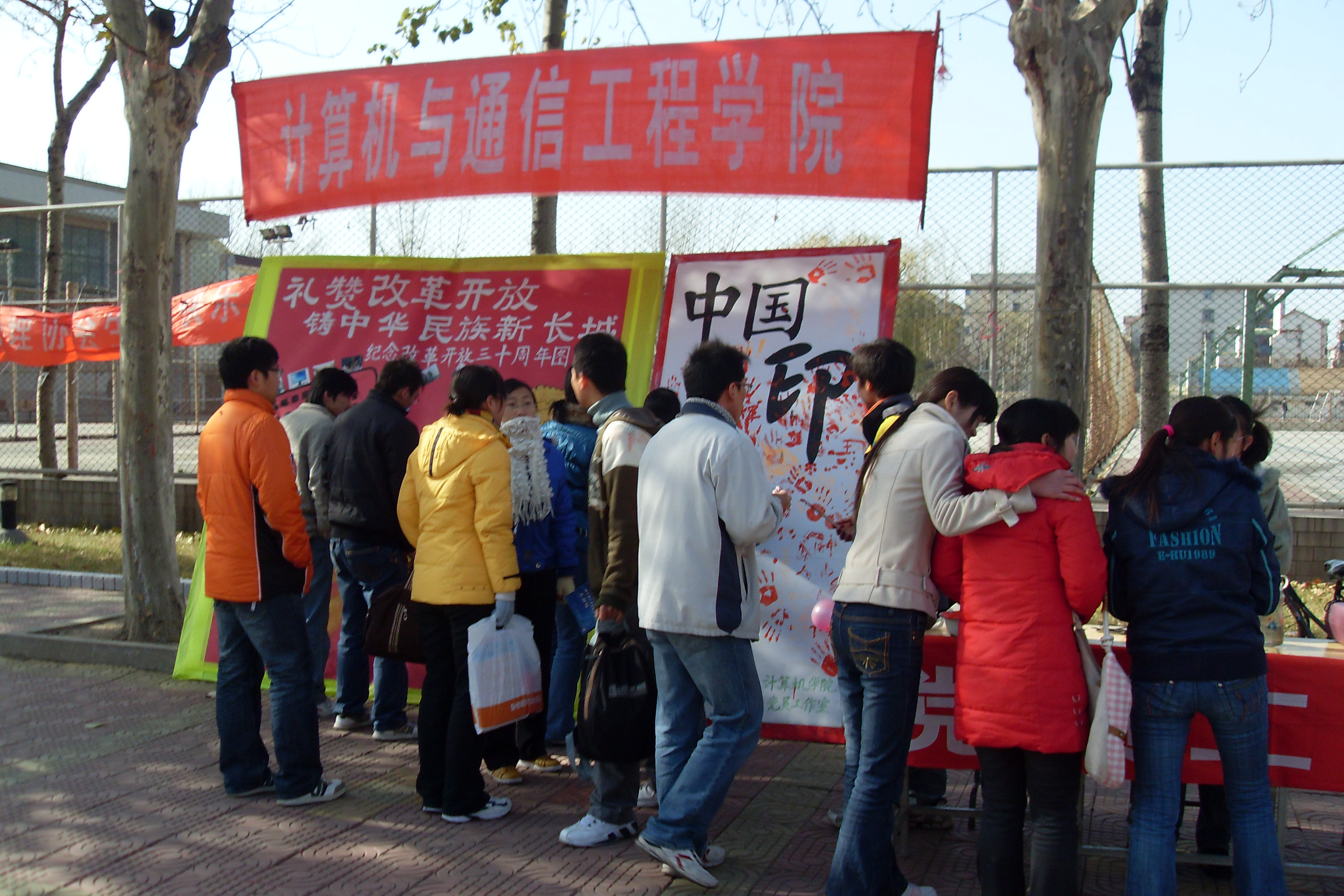 12月5日上午,计算机与通信工程学院在东风校区主干道上开展了“改革开放三十年看计算机的发展历史”活动图片展和爱国手印的征集活动。图片展出了改革开放前后我国计算机的发展历程以及我院实验室和计算中心陈列的计算机的发展变化,通过图片的对比让大家感受到改革开放三十年来计算机技术的飞速发展以及我院信息网络的发展历程。展览吸引了许多同学驻足观看,互相向同伴讲述着曾经发生在自己身上与之有关的故事。图片展形式生动,图片虽小,但从多角度展示了30年来计算机领域巨大的发展变化。同学们为祖国30年来的巨大变化感到骄傲,在新旧强烈的对比中,受到了爱国主义教育。