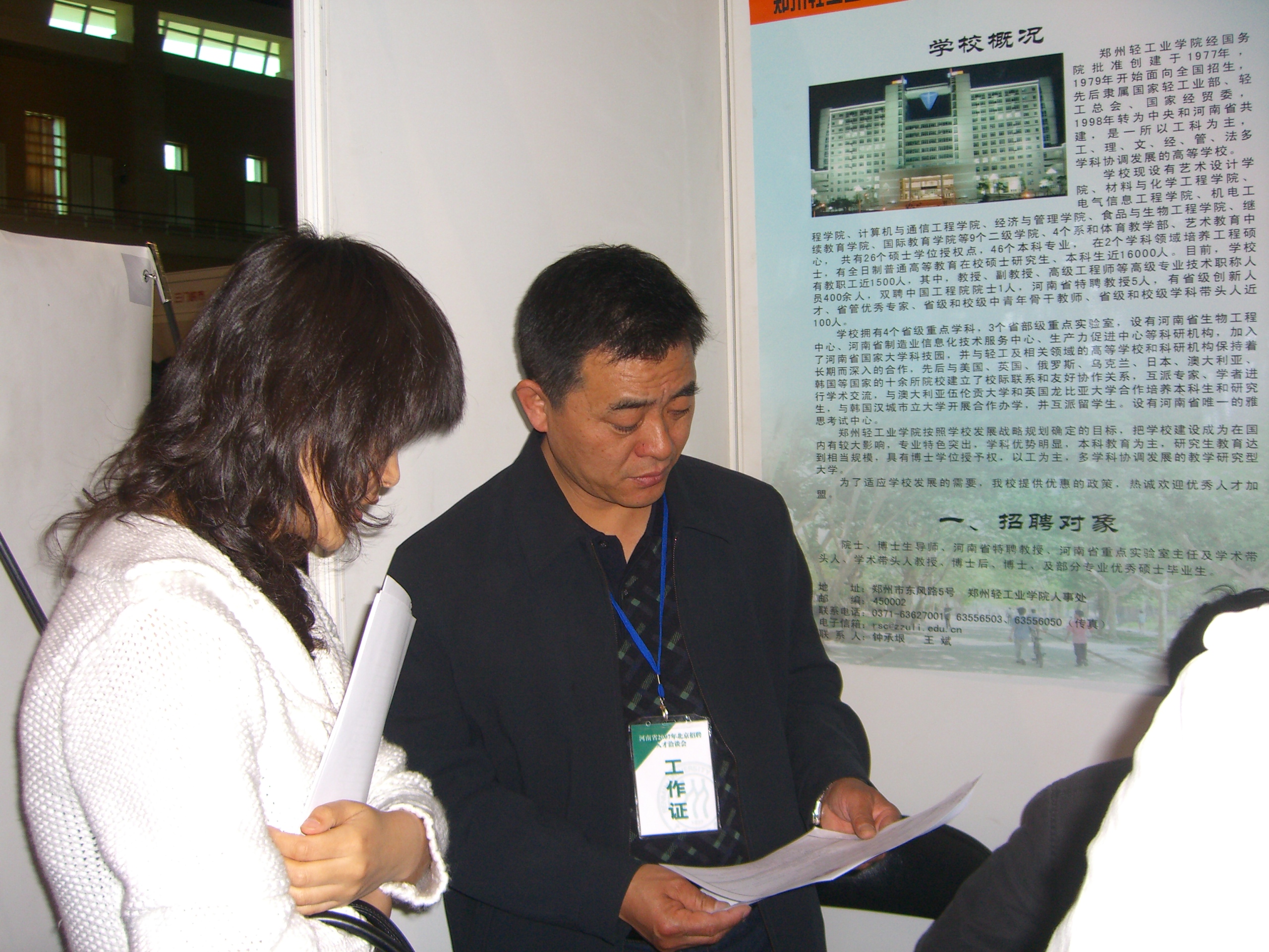 4月7日,由河南省委、省政府组织的2007年人才招聘大型现场会在北京中国人民大学世纪馆隆重举行。人事部人才交流开发司副司长余兴安、省人事厅厅长王平以及教育厅相关部门的负责人亲临招聘现场,人事部对这次招聘给予充分肯定。此次招聘会共有全省各地811家学校、科研单位、医疗机构、大中型企业,1.3万个岗位,全天共吸引了9000多名中高级人才到场应聘,最终达成初步意向的有2686人。