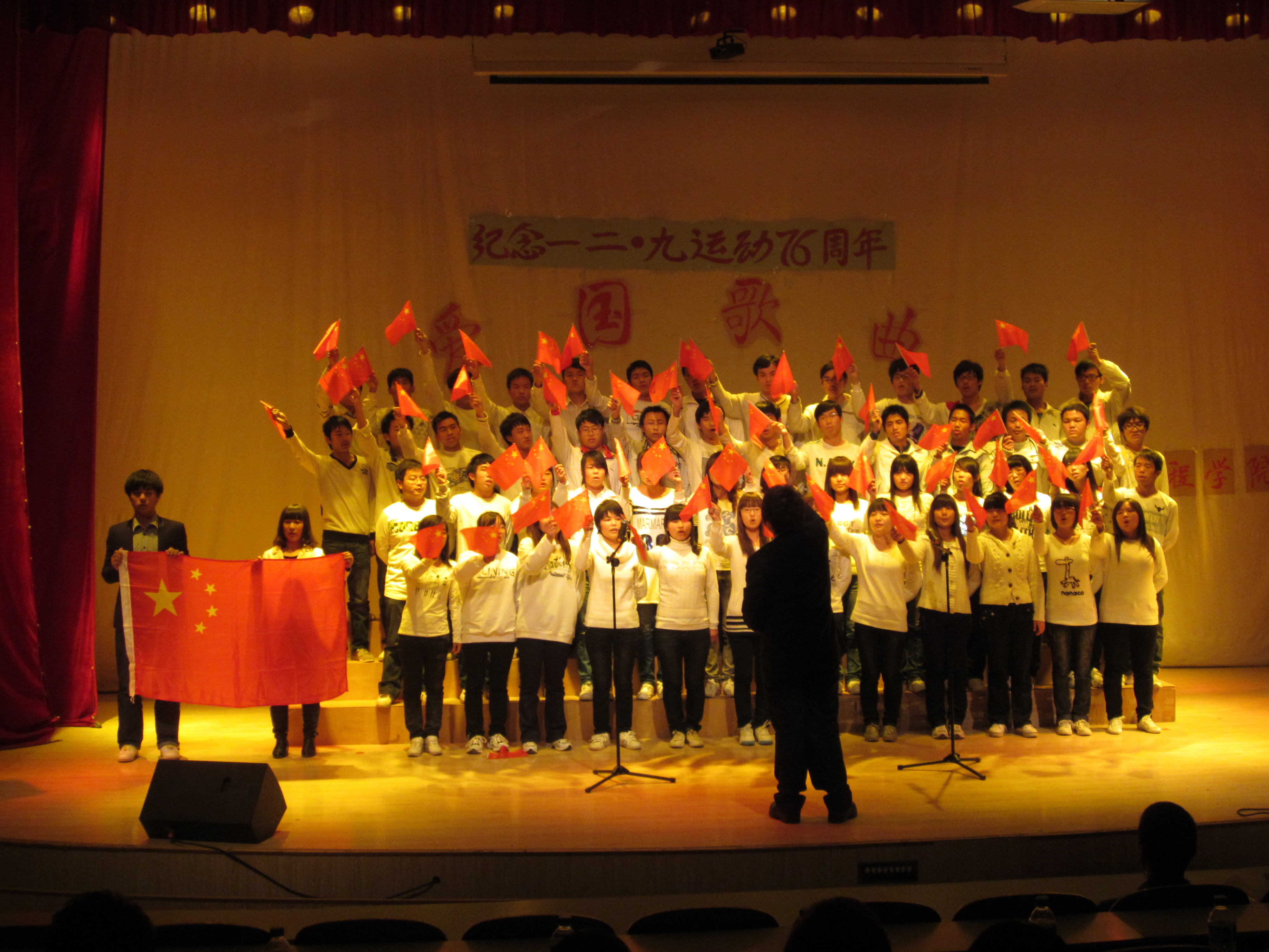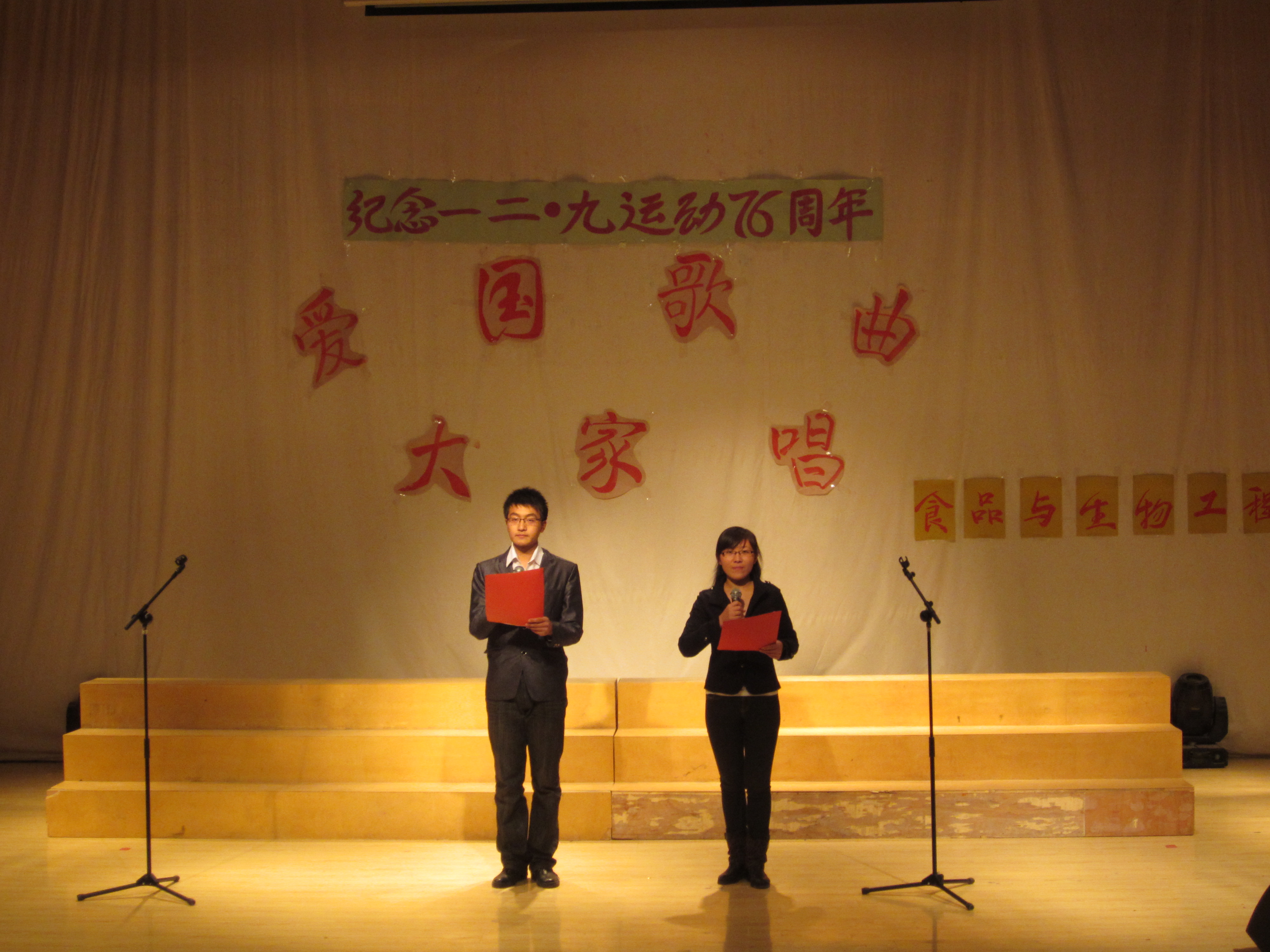 为纪念 “一二・九”运动76周年,弘扬爱国主义精神。11月18日晚上,食品与生物工程学院在科学校区电教楼208室举行了“爱国歌曲大家唱”活动。我院驻科学校区辅导员老师、高年级团学干部和2011级全体同学参加了此次活动。晚上7点整,比赛正式拉开帷幕。同学们演唱了《保卫黄河》、《精忠报国》、《阳光总在风雨后》等爱国、励志曲目;展示了精心准备的国旗和标语等;共同表达了对美好祖国的热爱和对美好生活的向往。演出现场,台上红旗招展,台下掌声四起。经过激烈的角逐,烟草工程11-1班获得一等奖,食品科学与工程11-2班获得二等奖,生物工程11-1班获得三等奖,食品科学与工程11-1、食品科学与工程11-3班、生物技术11-1班合唱队获得优秀奖。
