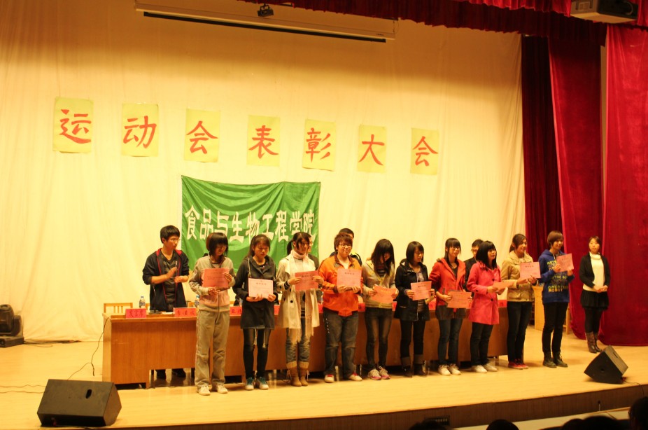 在科学校区第二届田径运动会中,我院精心组织、认真备战,一举获得男女团体第一名和女子团体第一名的优异成绩。为了表彰先进,形成团结协作、奋勇争先的风气,11月13日,食品与生物工程学院在科学校区电教楼208教室成功举行运动会表彰大会。我院驻科学校区辅导员、运动员、运动会组织人员和2011级全体新生参加了表彰会。