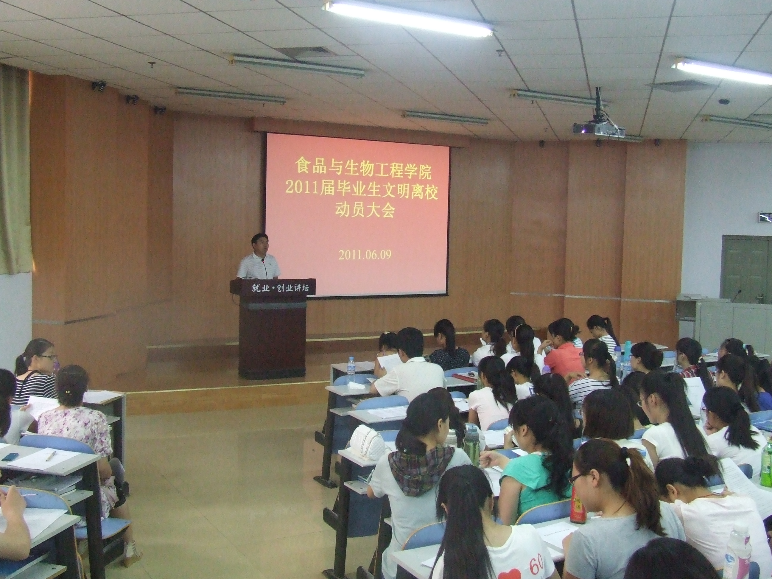 6月10日,食品与生物工程学院在教三楼103再次召开2011届毕业生文明离校教育大会。学院党总支吴占超副书记、负责学院就业工作的孙浩老师及全体2011届毕业生参加了此次会议。