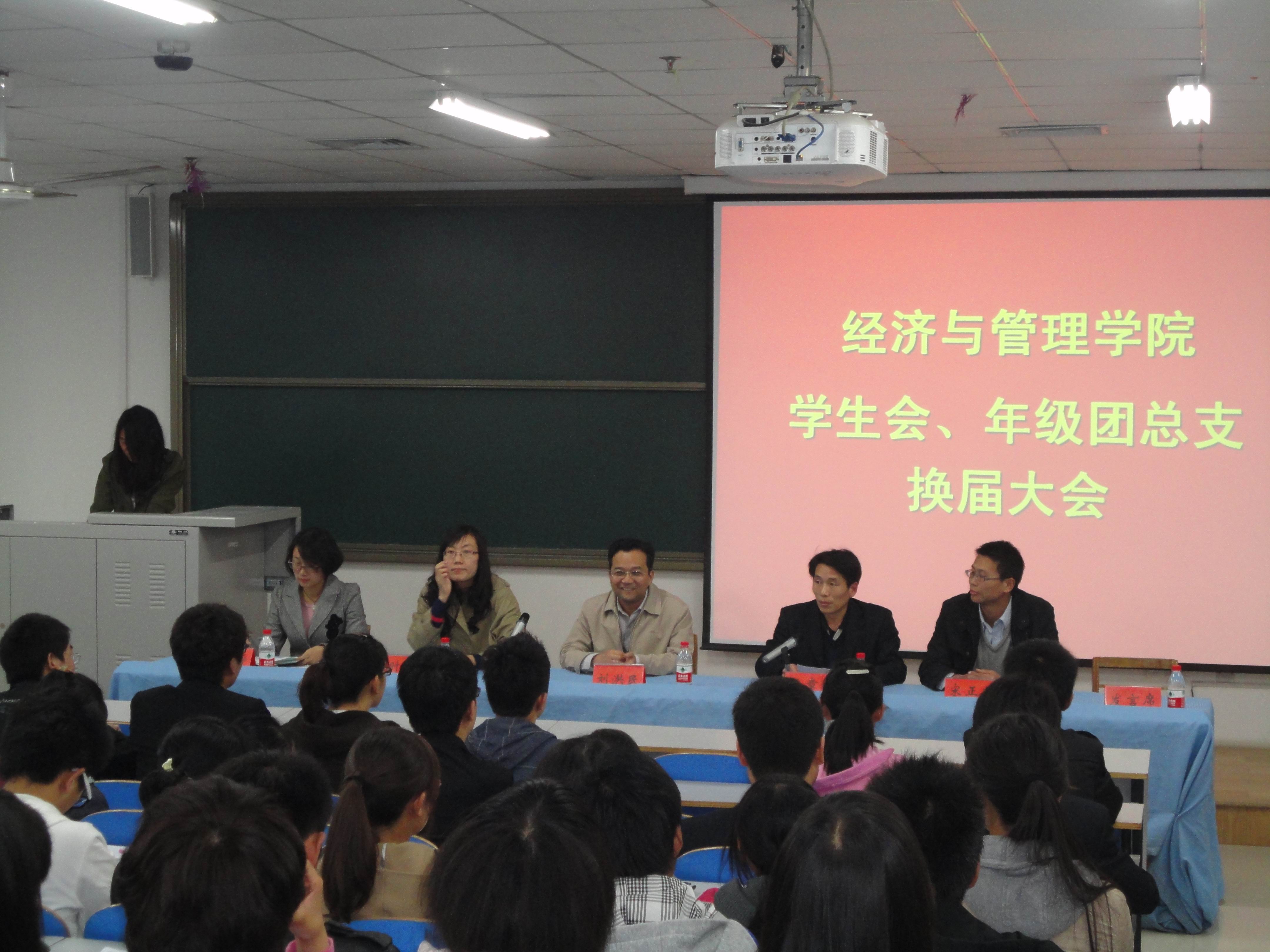 10月28日下午,经济与管理学院学生会、年级团总支换届大会在科学校区电教楼403室隆重举行。经济与管理学院党总支副书记刘洪民、分团委、学工办全体老师出席了本次大会,上一届学生会主要学生干部、新一届学生会和2009、2010级年级团总支全体成员参加了会议。会议由分团委书记陈章美主持。