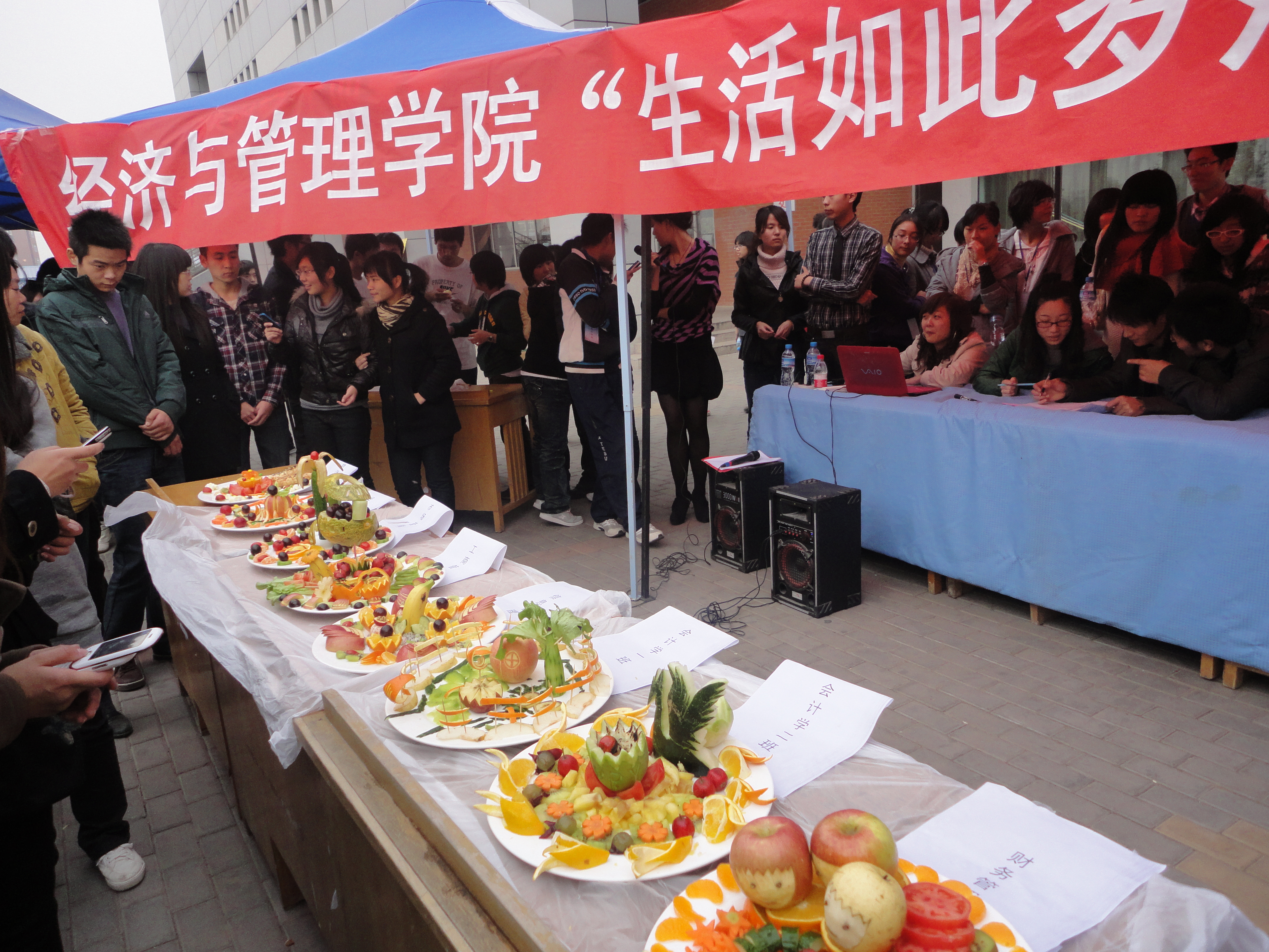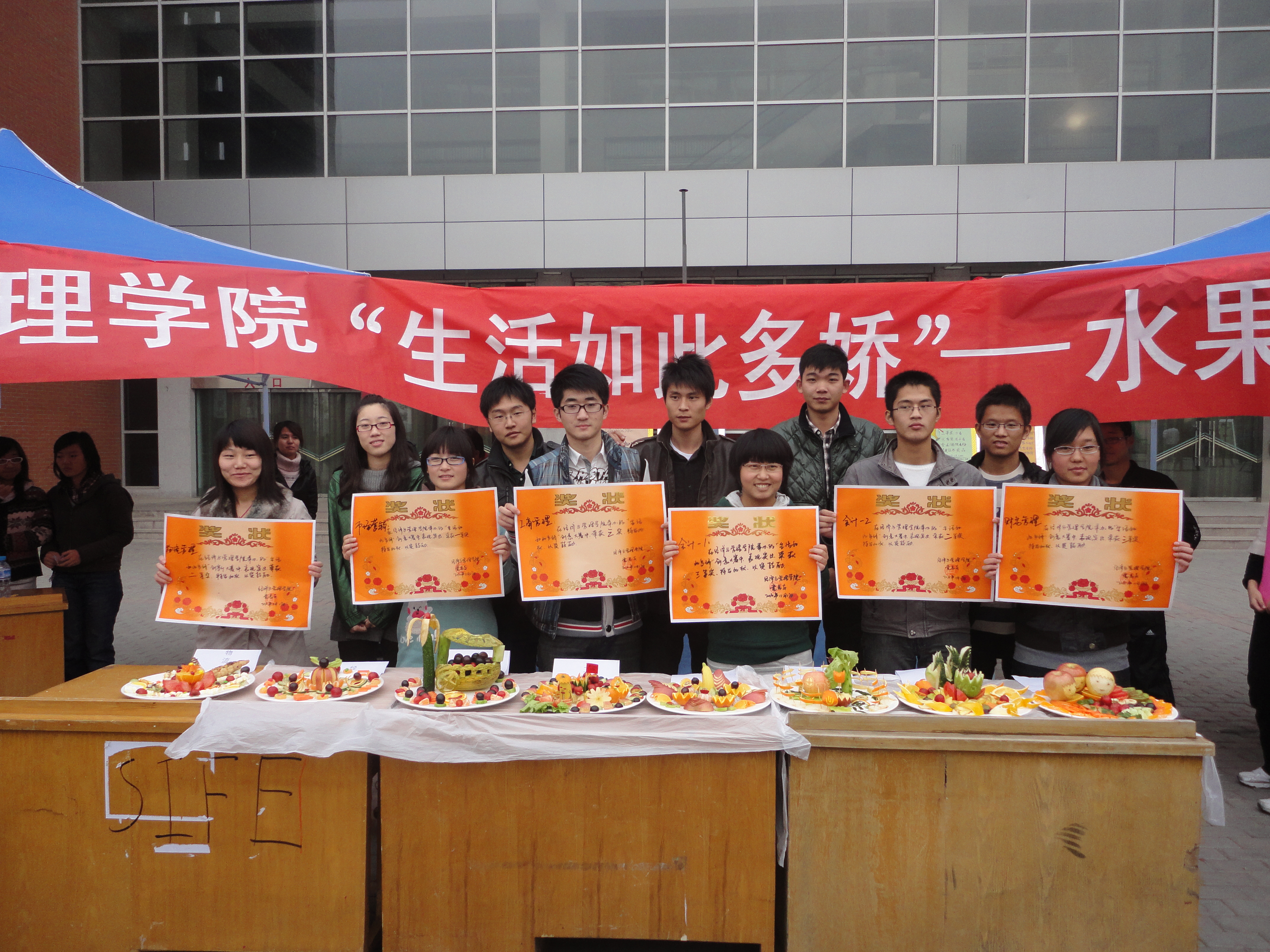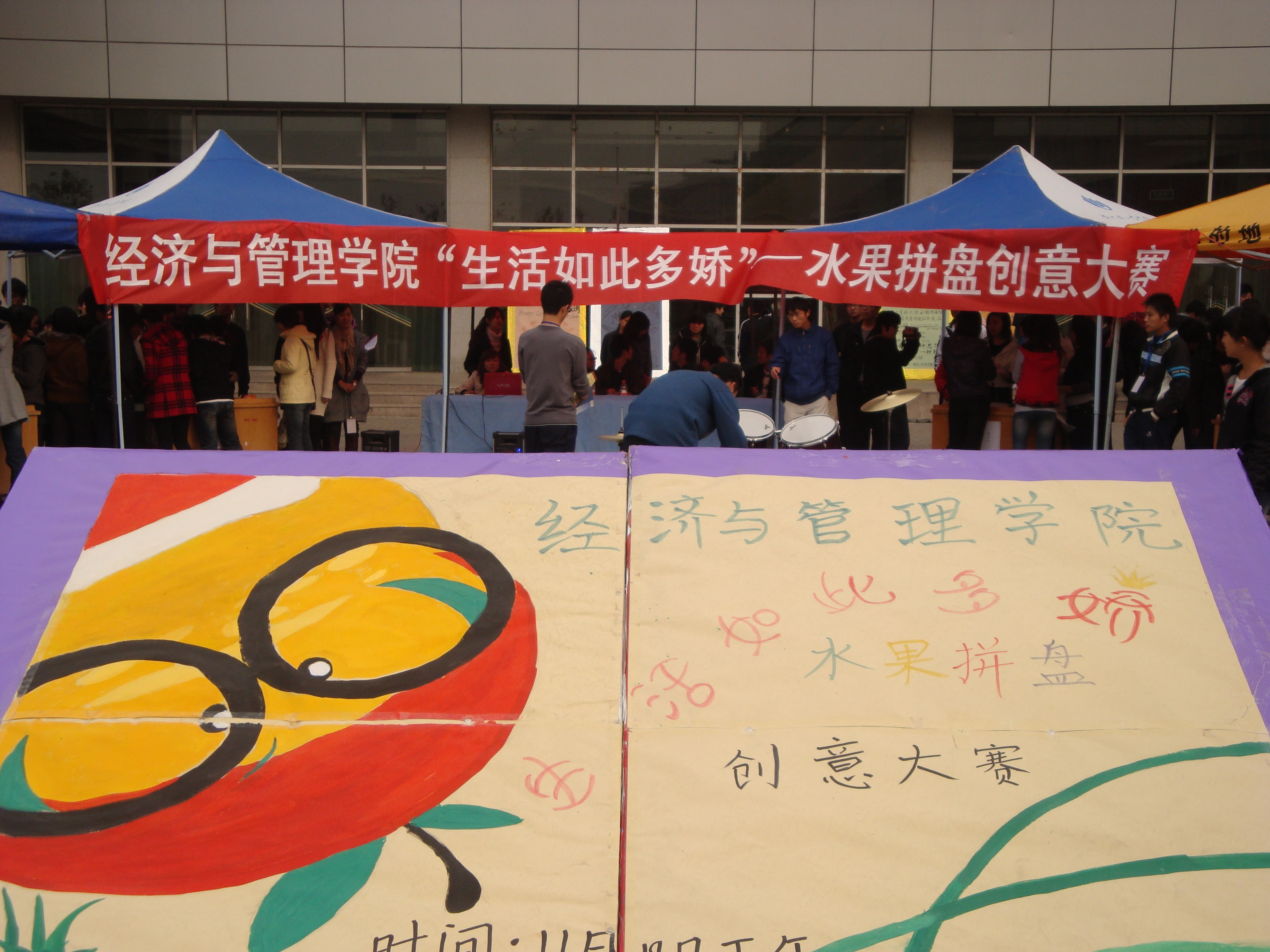 为了培养同学们的创新意识,提高同学们的想象力和实际动手能力,丰富同学们的课余文化生活,11月18日下午,经济与管理学院在科学校区生活服务中心门前举办了第一届“生活如此多娇――水果拼盘”创意大赛。经过公平、公正、公开的评比,共评出一等奖1名,二等奖2名,三等奖3名,优秀奖2名。