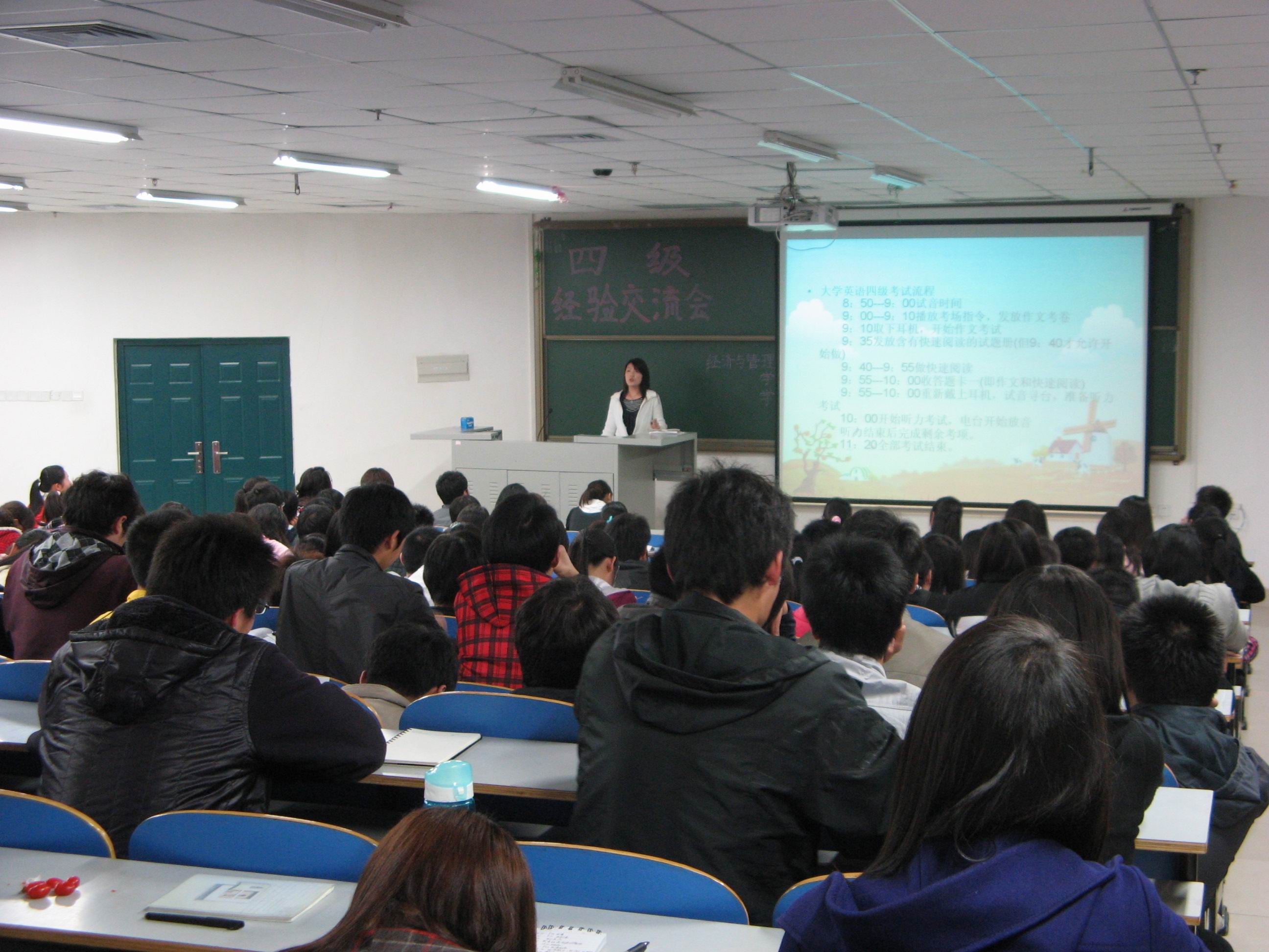 为了帮助2009级新生全面深入地了解英语四级考试,明确考试重点,掌握考试时间、技巧,提高学习效率,4月16日晚7:00,经济与管理学院在科学校区电教楼109举办了英语四级学习经验交流会。